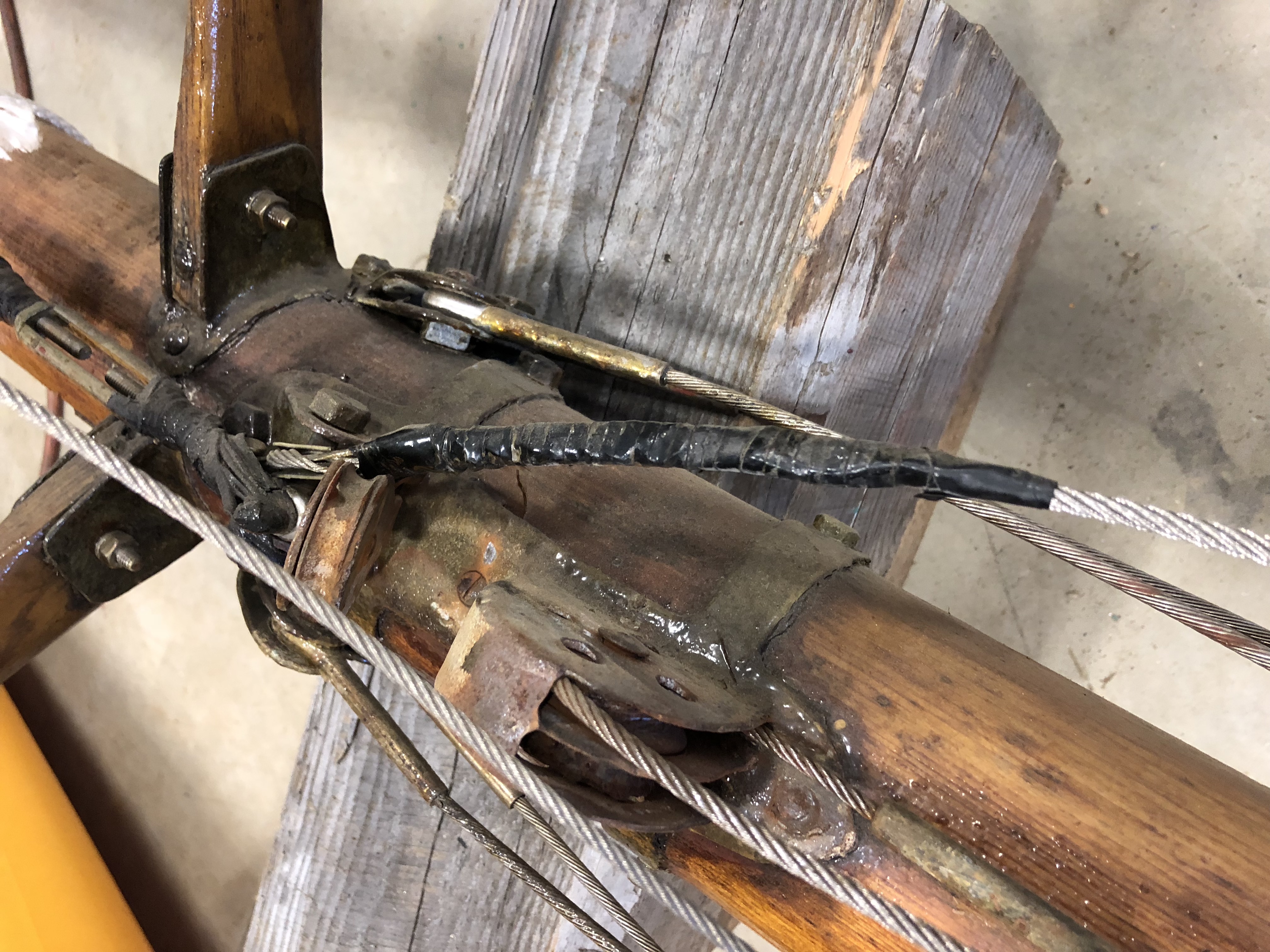 For the first five or so years of the restoration, the mast hung up on the wall of a boatyard shed. So when we were finally ready to think about rigging, the first step was a thorough rig inspection. We pulled the mast out of storage, set it on sawhorses, and started looking. It was worse than we remembered.