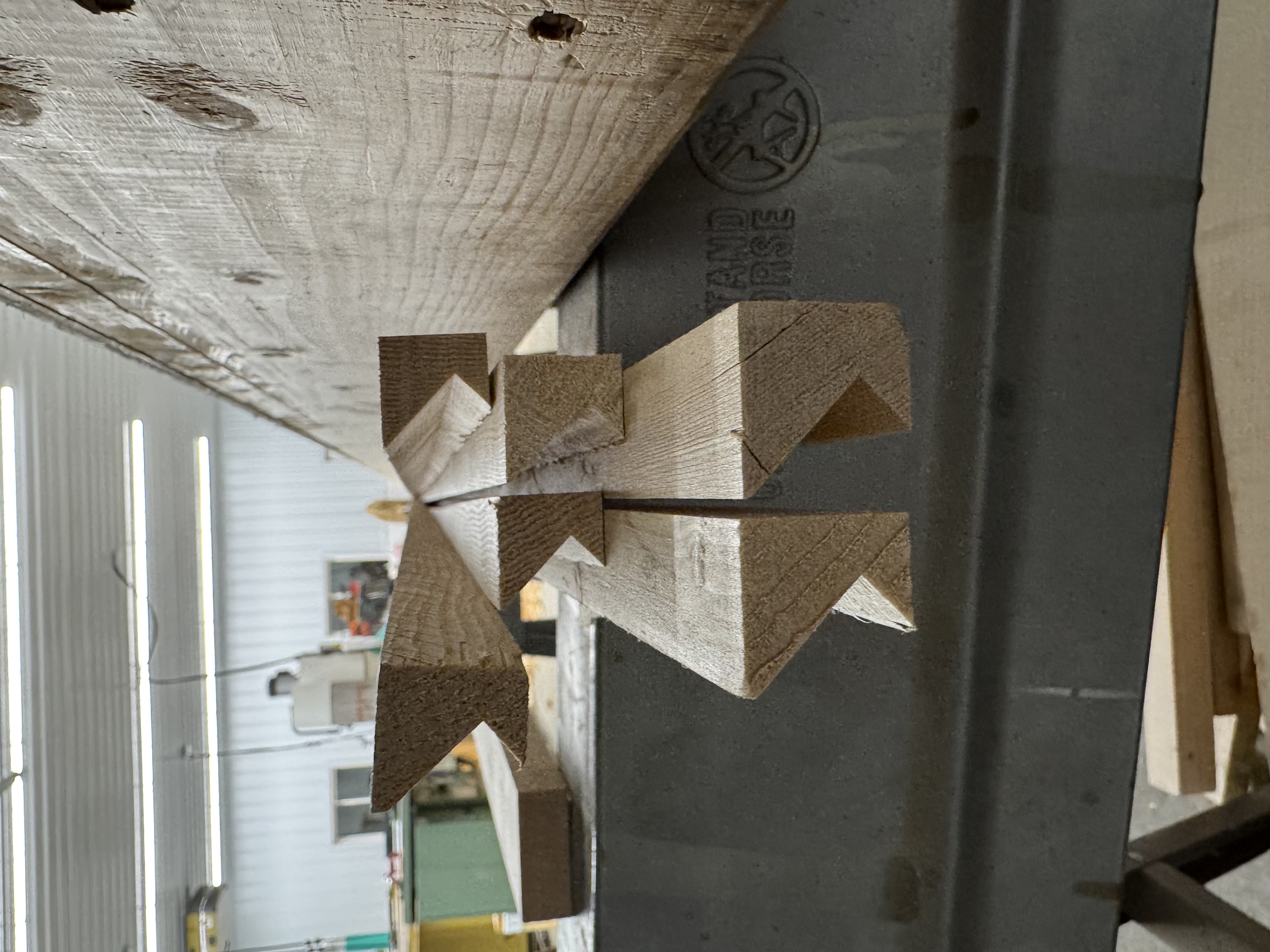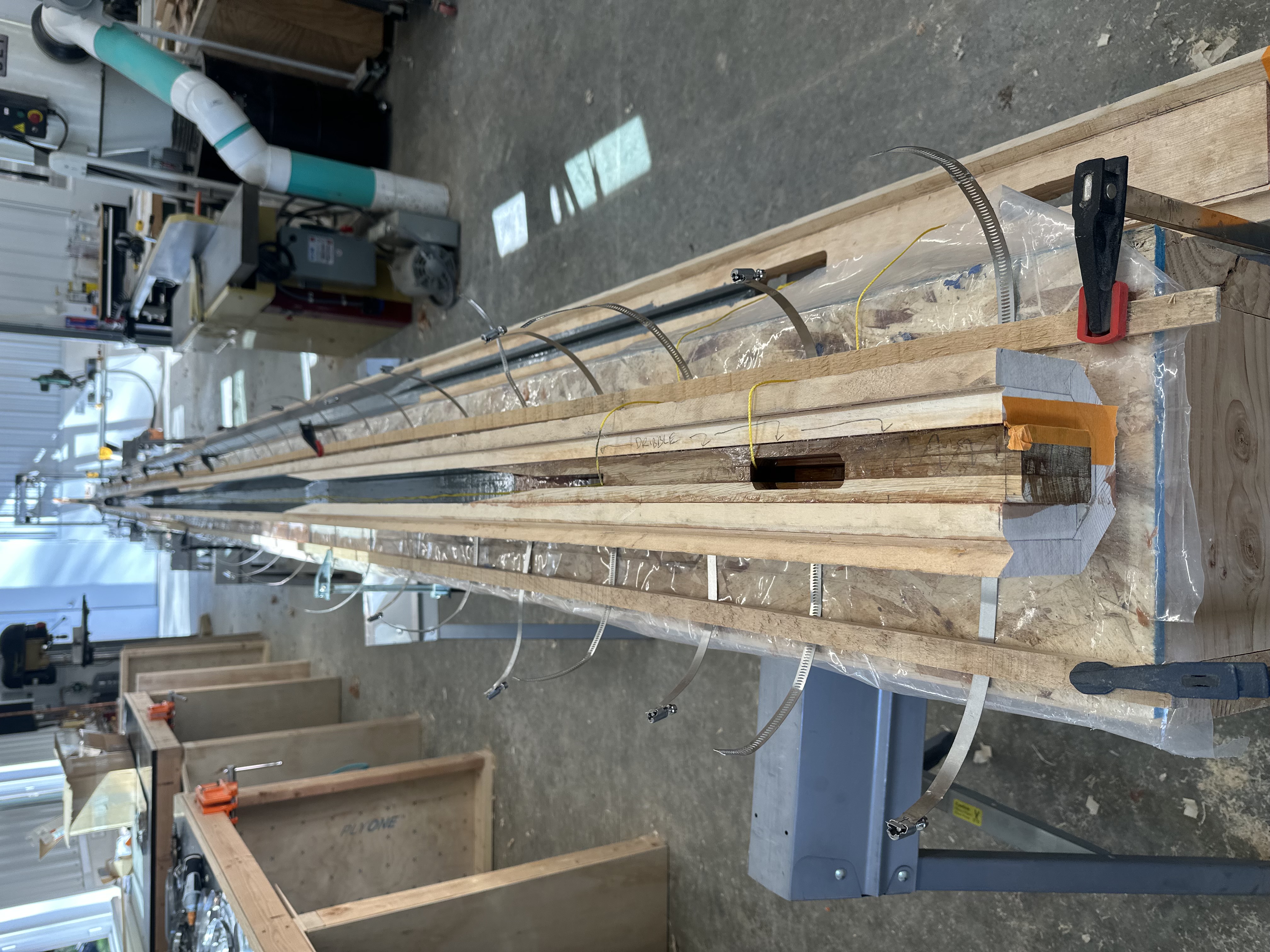 Building our mast was a multi-stage process. The first glue-up joined the staves into two halves — five staves in the larger half, three in the smaller — leaving the joints between the halves unglued so we could take it apart. After this step, we needed the interior to remain accessible for interior blocking, rigging, and sealing.