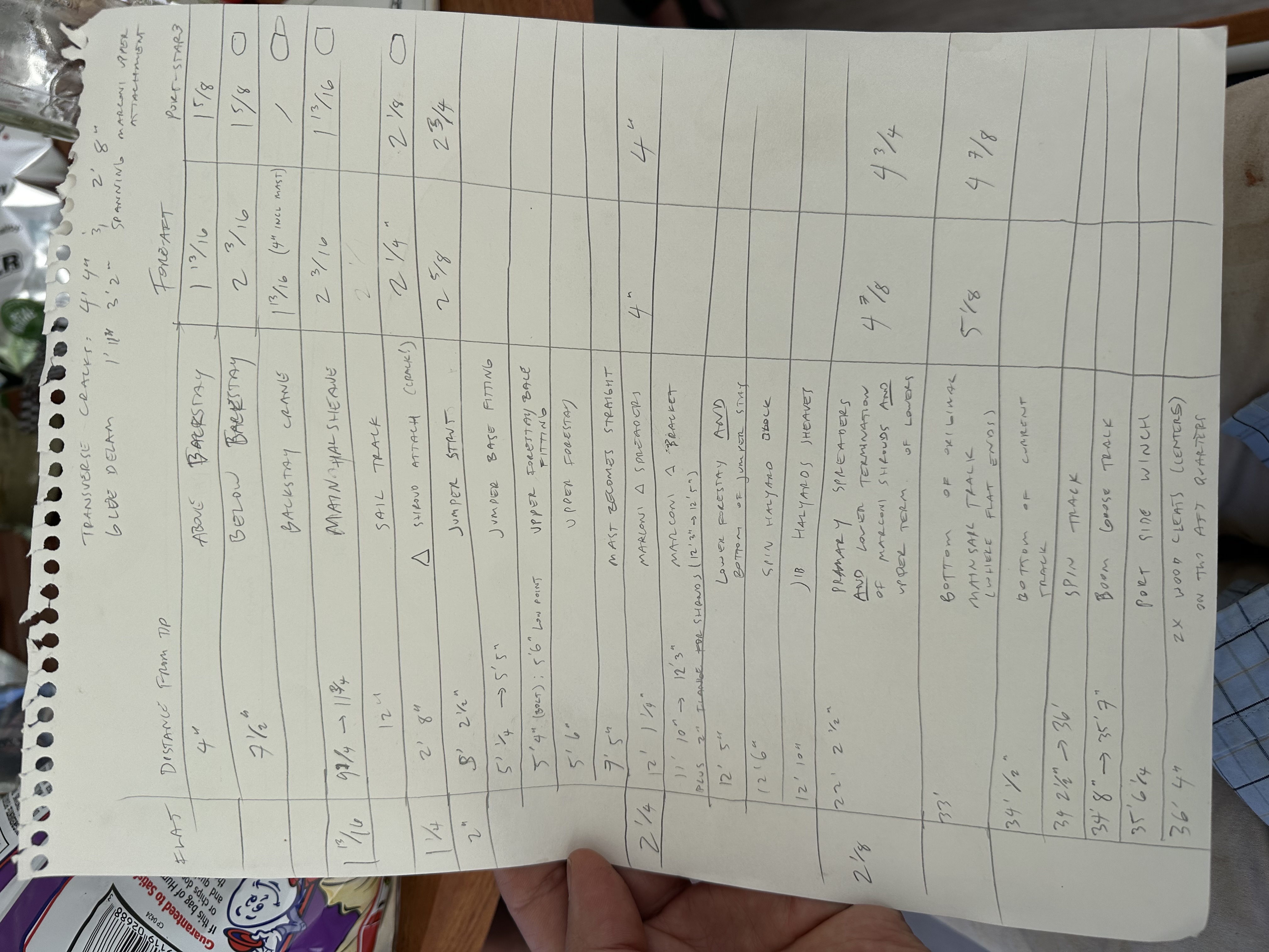 Before we could build a replacement, we needed to pull an array of important measurements from what we were replacing. We recorded every identifiable dimension of the old spar — cross-sections at regular intervals, locations of every fitting and feature, the taper profile, the curve at the mast tip, the flat for the sail track.