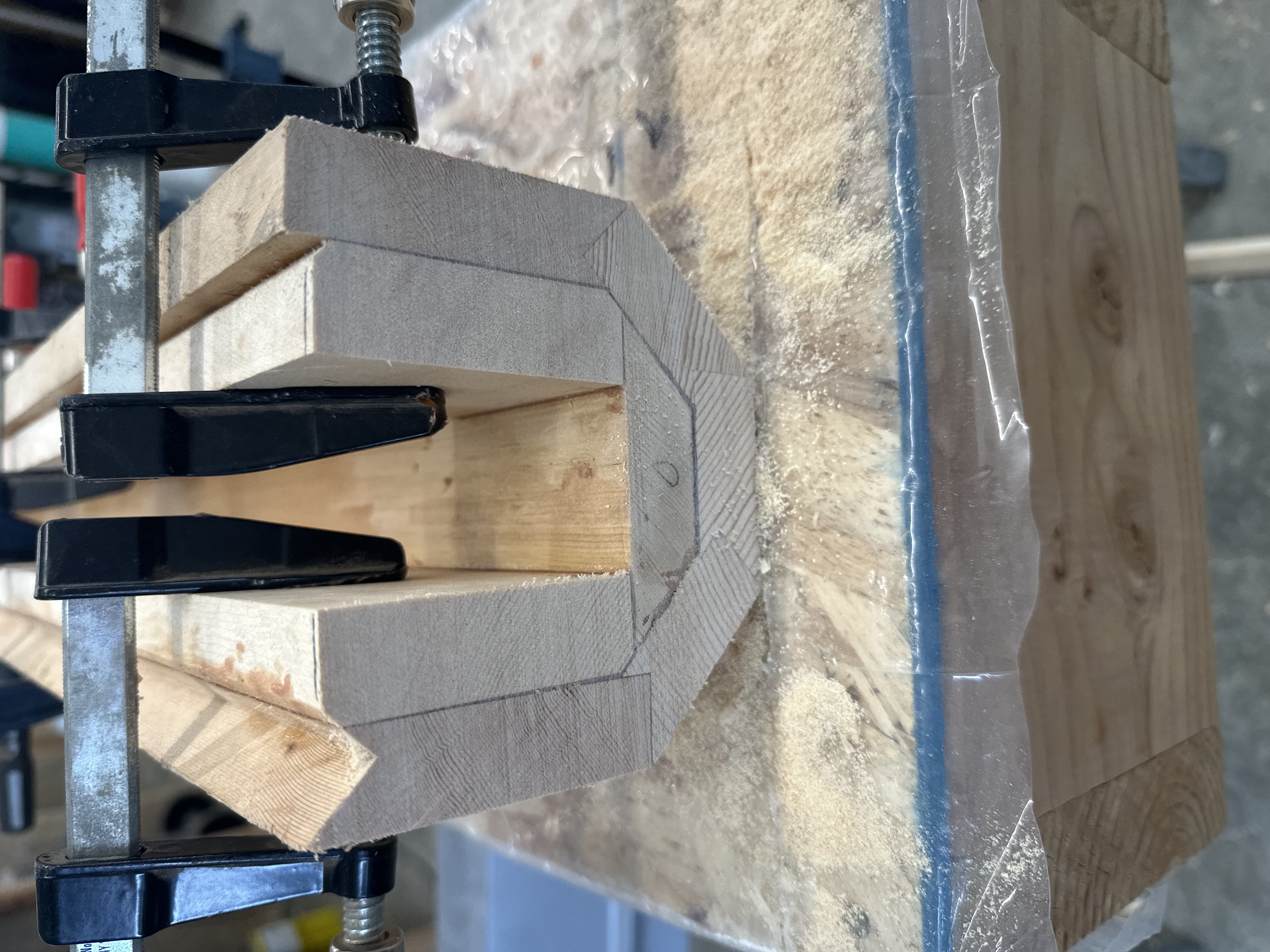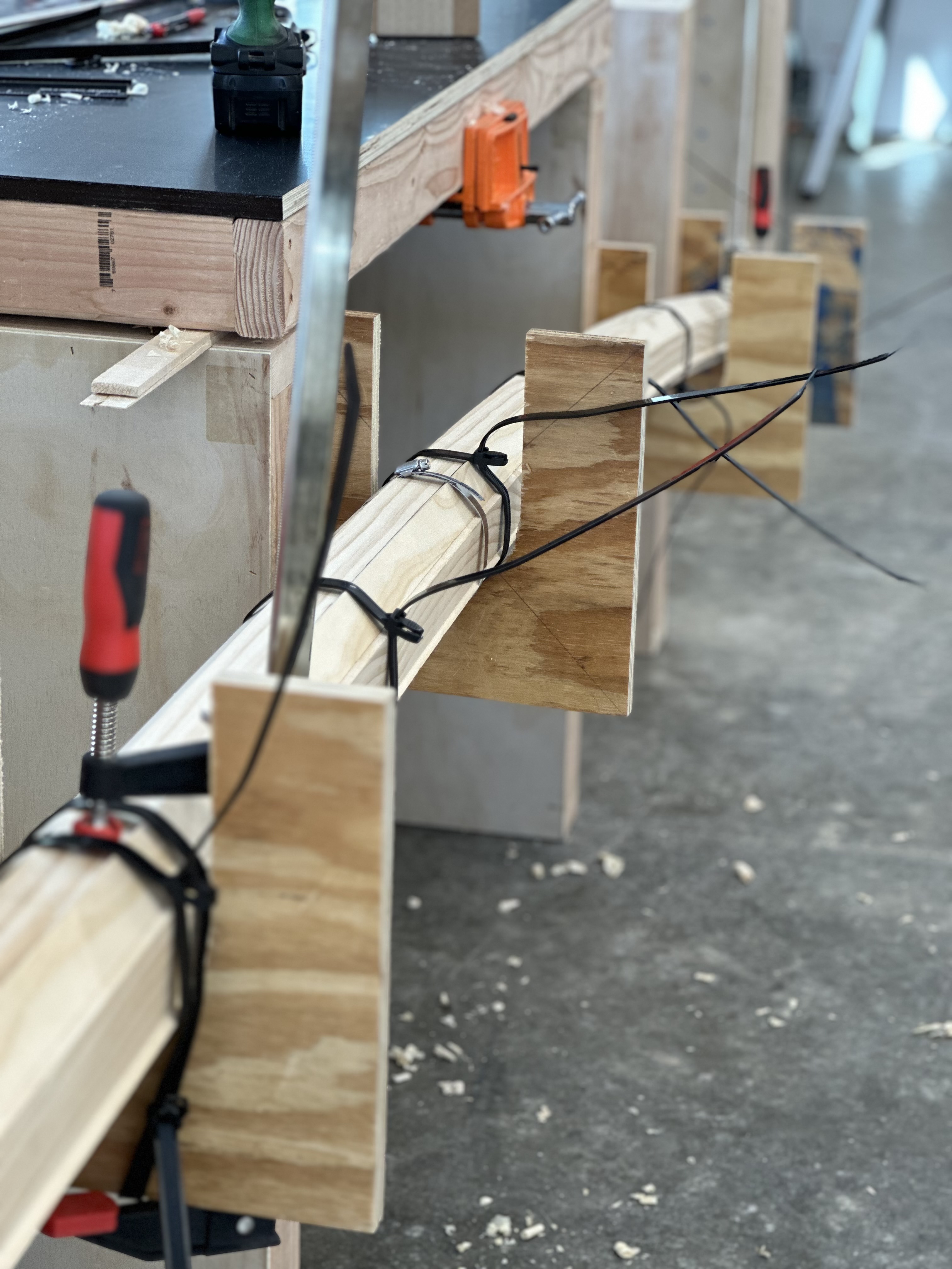 Before committing to the full-length glue-up, we built a test section to answer a few questions. We wanted to try out birdsmouth construction before committing to it — where the staves have mating V-grooves along their edges instead of flat joints — and we wanted to see what would happen if we glued in a pre-bend at the mast tip. How much would the bend spring back after the clamps came off? Would the curve introduce voids between the staves? The test piece also let us experiment with clamping methods.