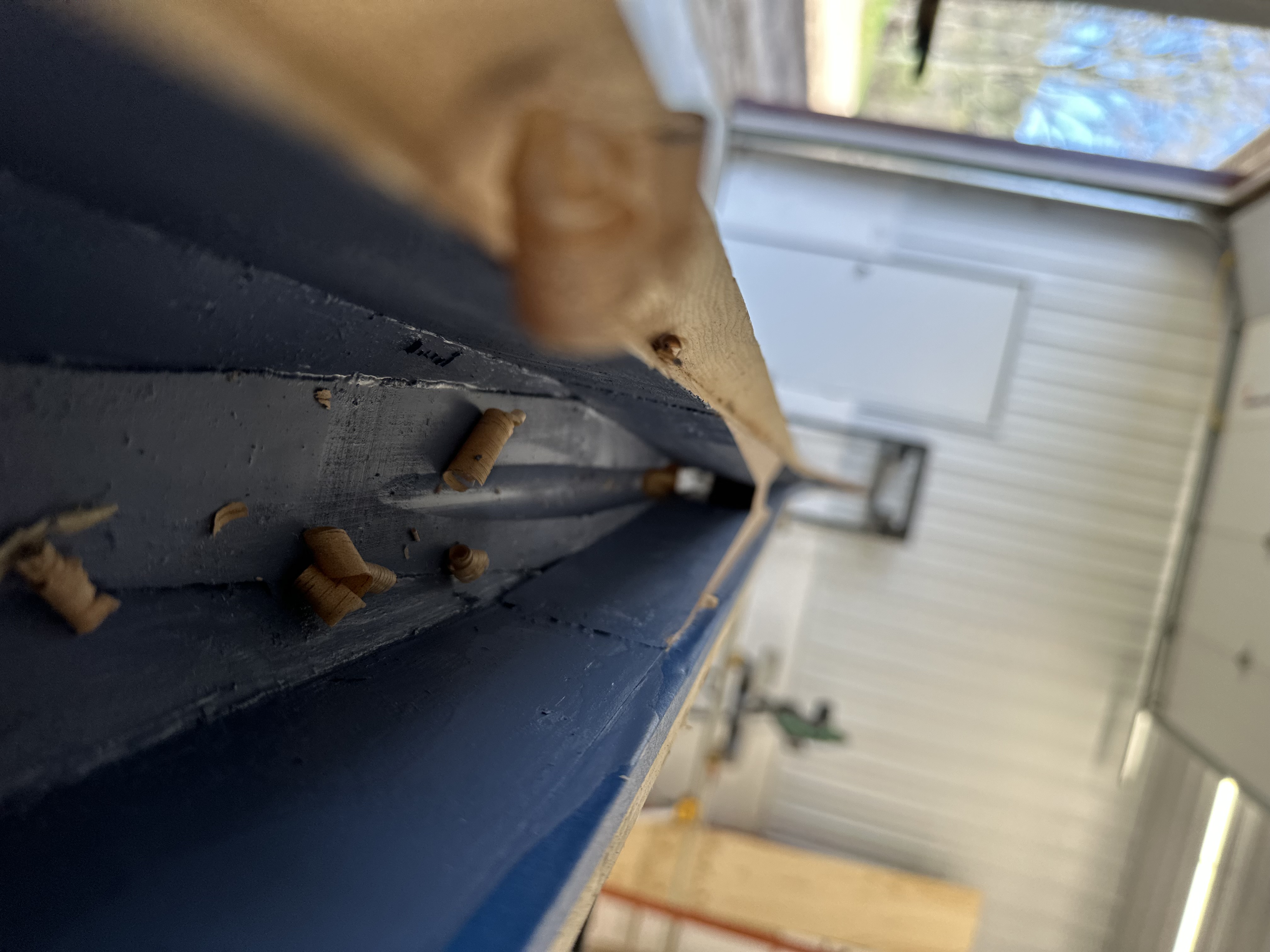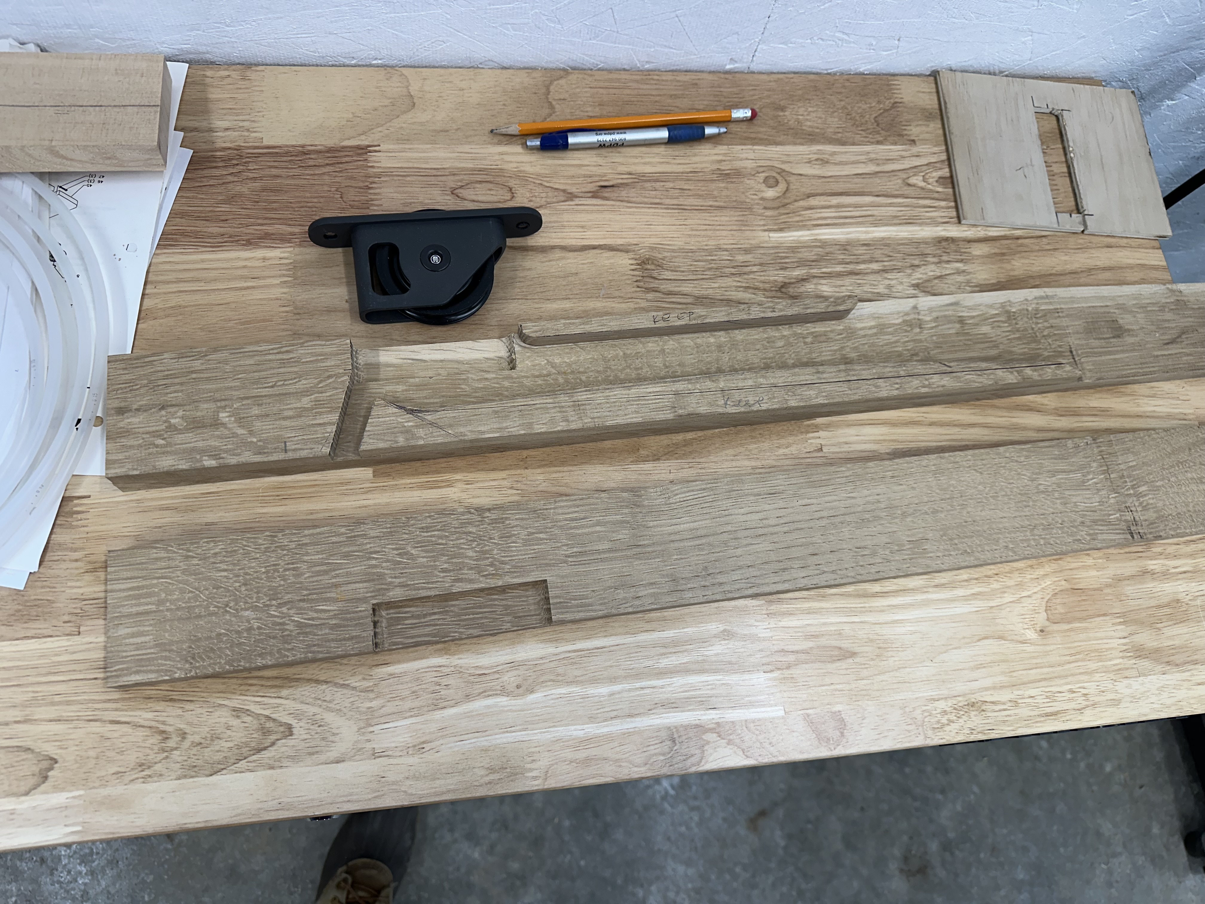 Each stave is assembled from two or three shorter pieces joined with epoxied scarf joints — long, angled glue joints that are effectively invisible once faired and stronger than the surrounding wood.