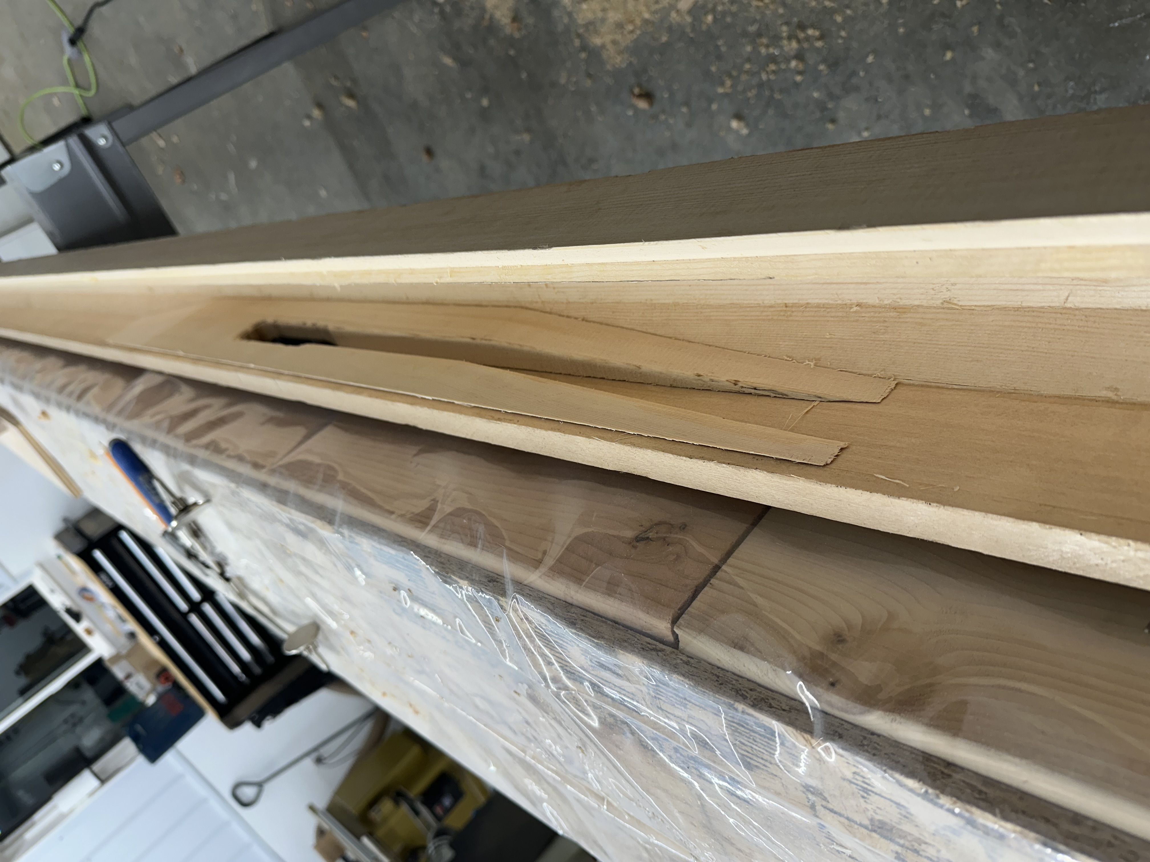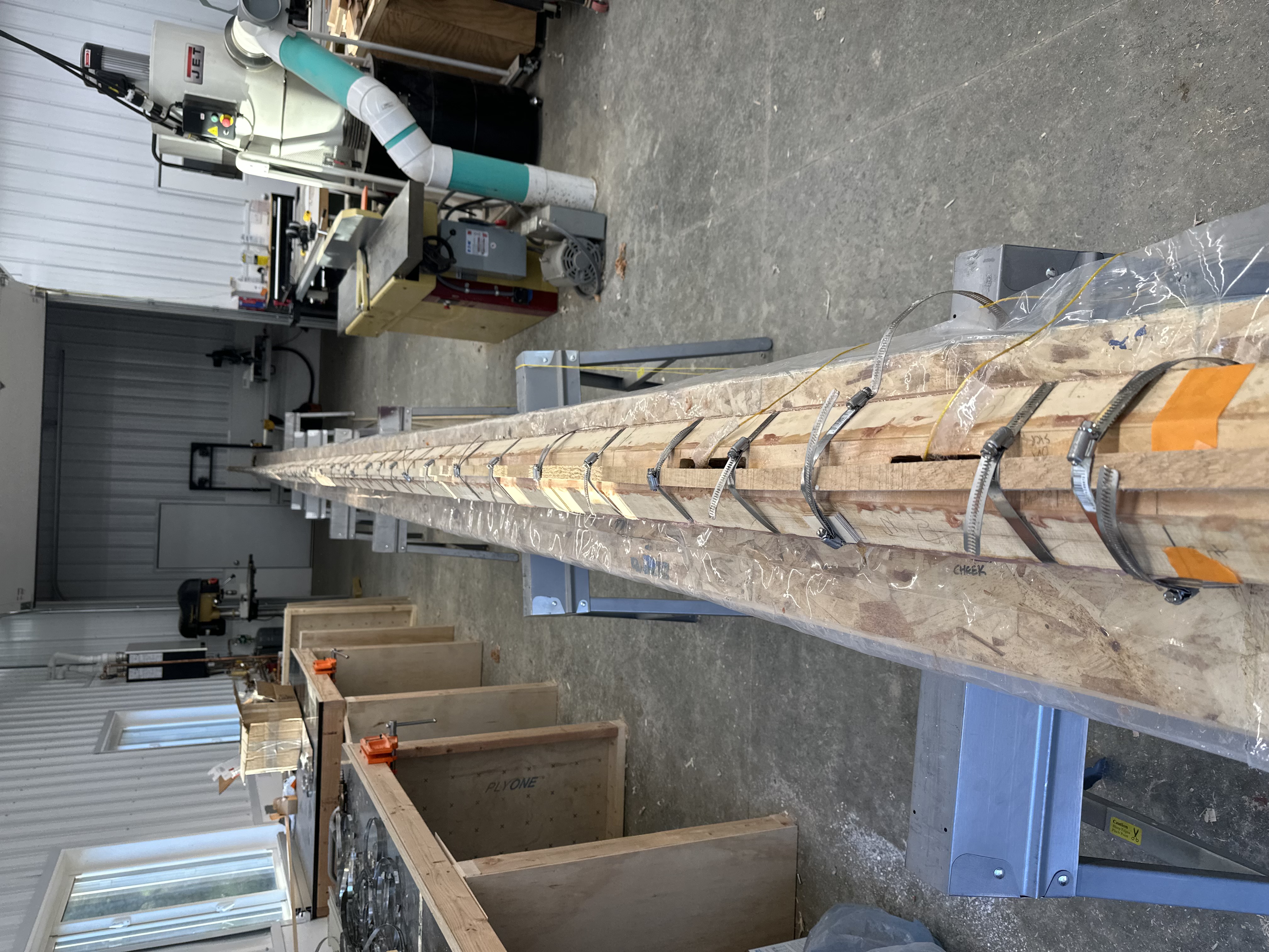 A mast looks like a long stick, but it’s actually built like a barrel. The new spar is hollow — eight spruce staves glued up around a central cavity, like coopering a cask. The staves taper in both width and thickness along their forty-foot run, so the finished spar has the correct cross-section at every point from heel to masthead.
