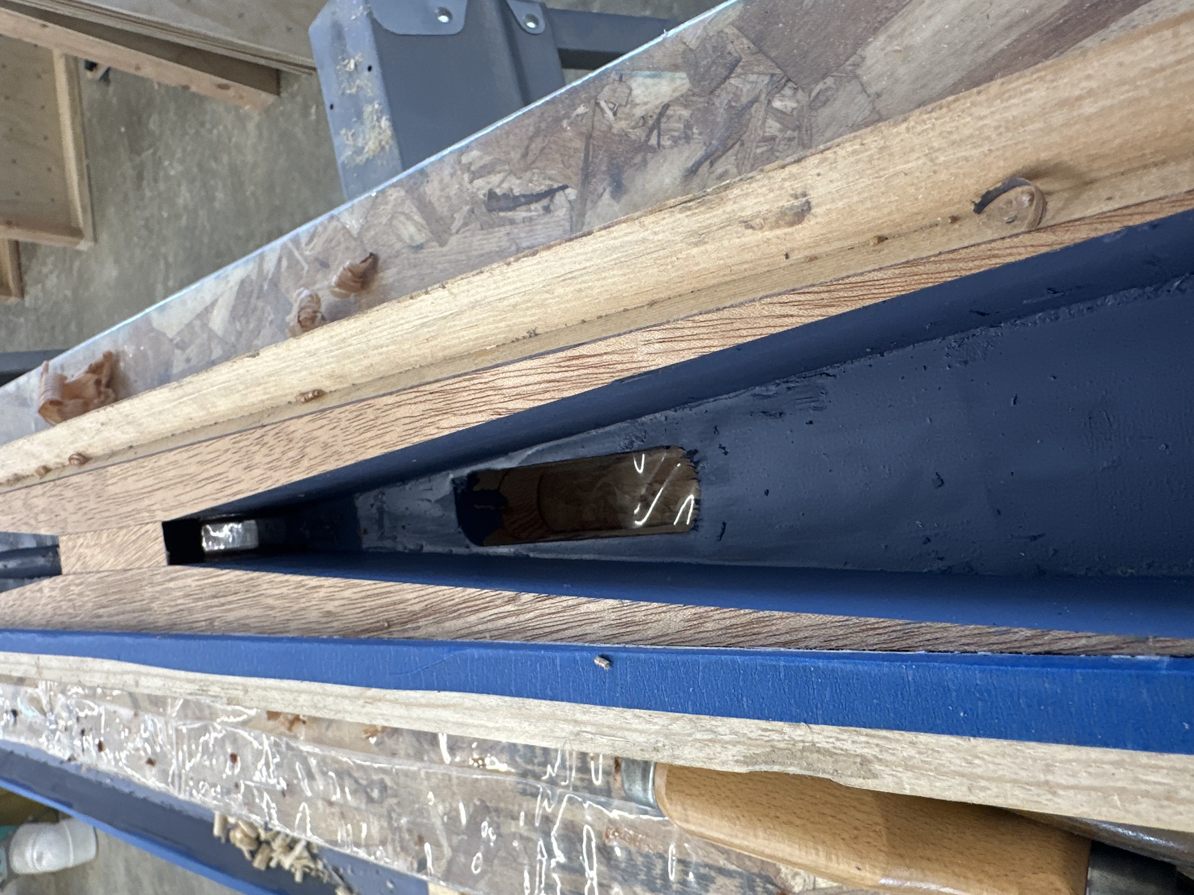 Once all the blocking and hardware is positioned, everything gets glued in and the interior gets a coat of bilge paint to protect against condensation moisture.