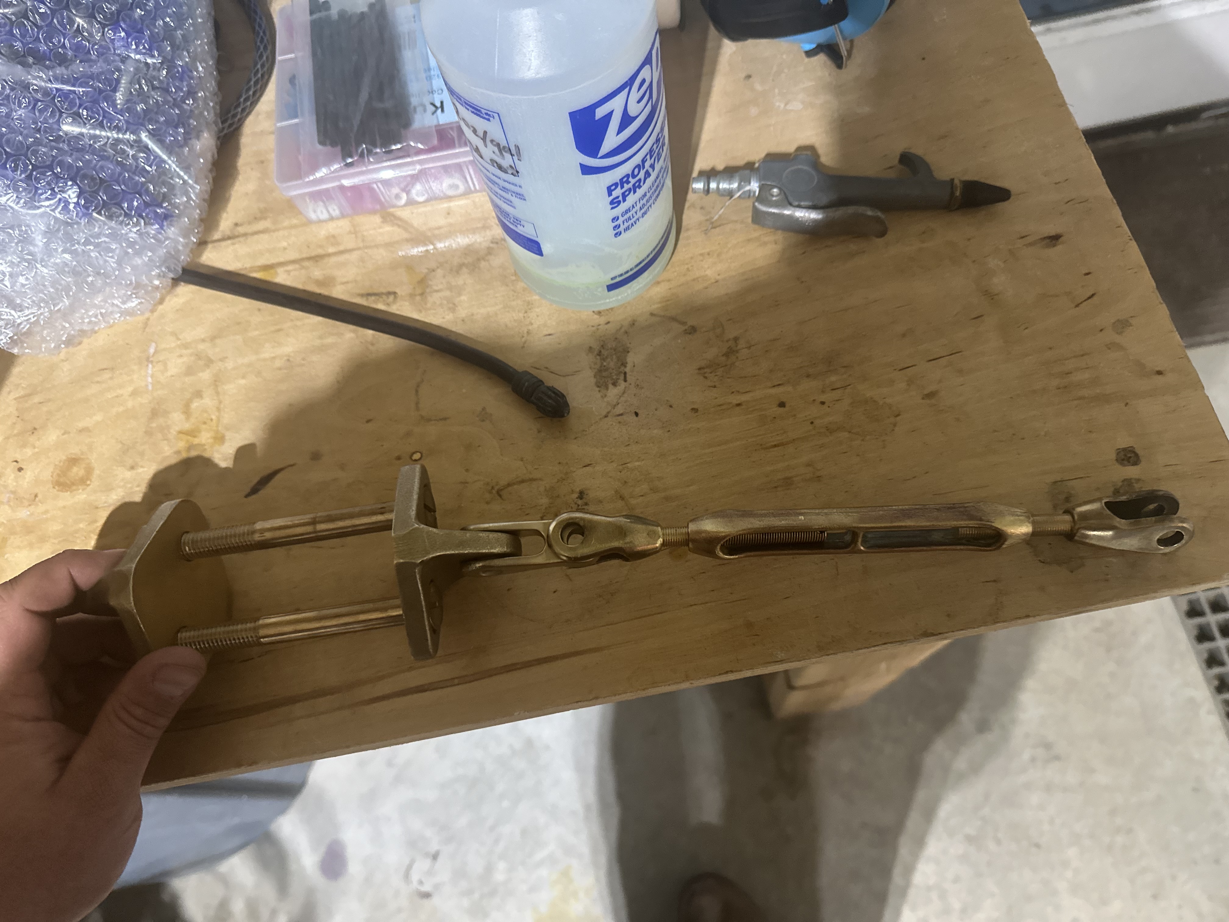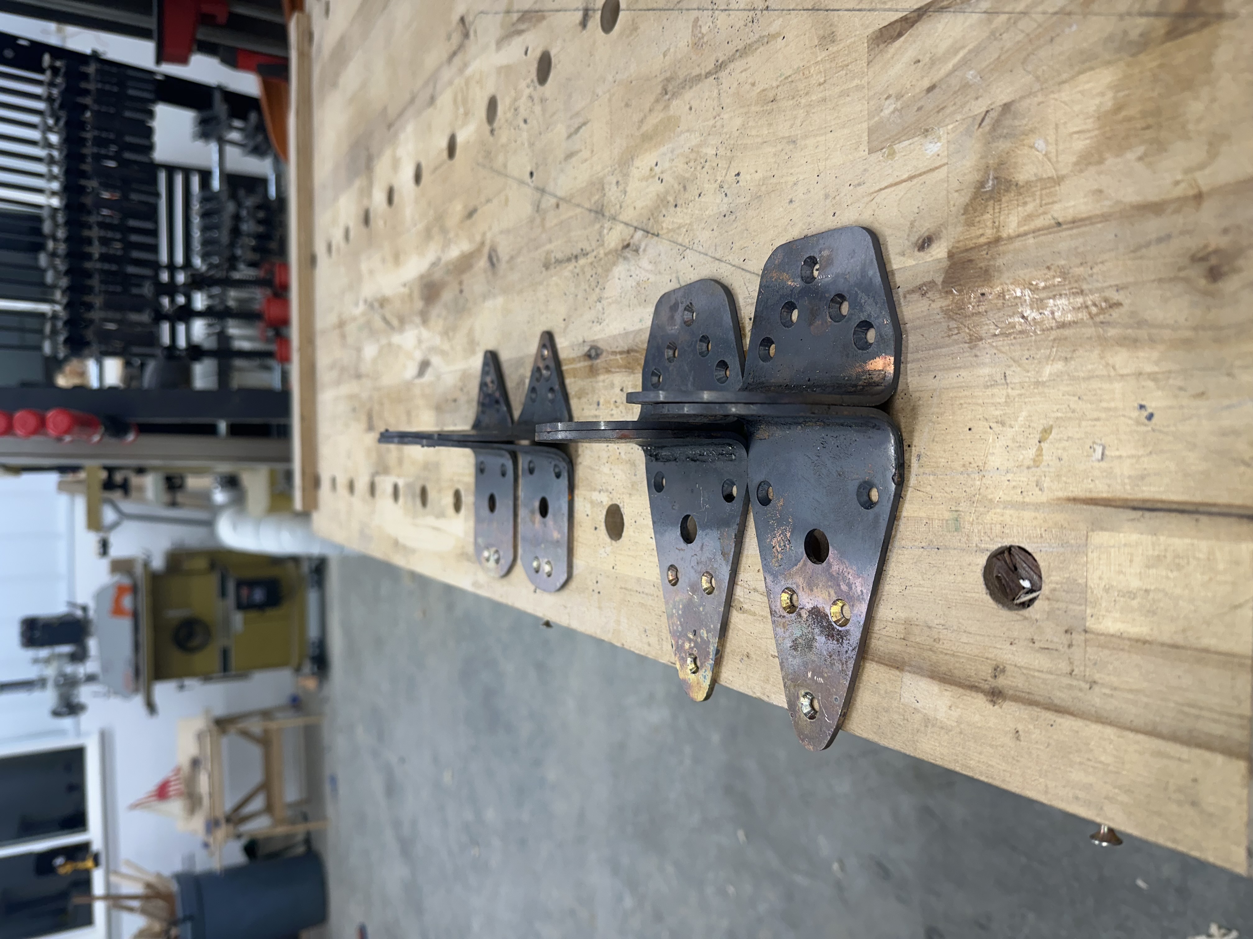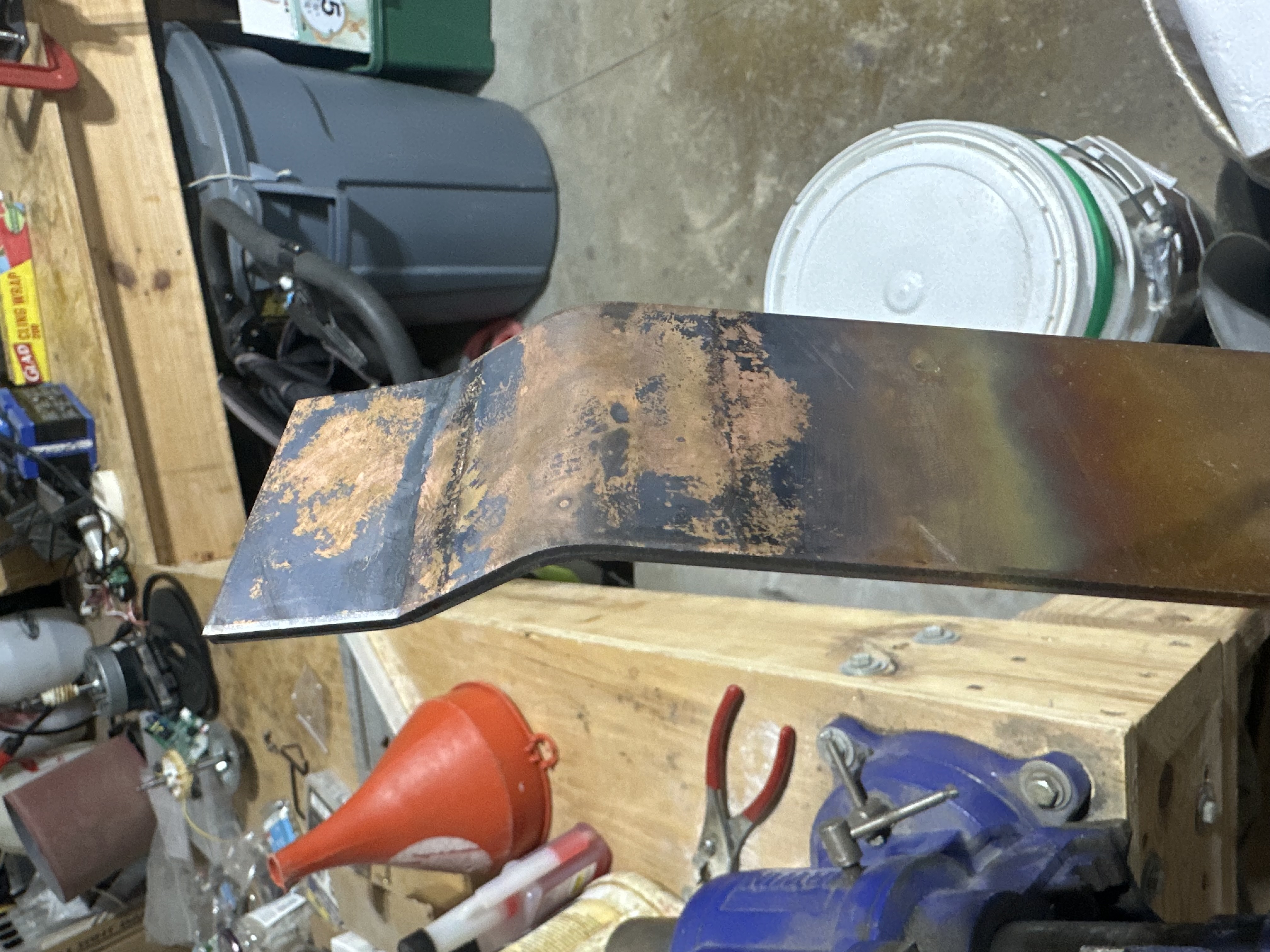 Working with bronze sheet turned out to be a bit of its own education. We needed 90-degree bends for the spreader brackets and dogleg bends for the shroud tangs. We wanted silicon bronze — the gold standard for marine hardware — but couldn’t find it in half-hard or annealed temper. What we could get was phosphor bronze, which is harder and less pliable, but still marketed as bendable. We learned, however, that phosphor bronze in full-hard temper doesn’t want to take a sharp bend without cracking. We decide it was OK to get around this with annealing: heating the metal to just below cherry red (turn the lights off!) and working it while hot. But you have to anneal before every major bend, and clean it up afterwards, which is a bit annoying.