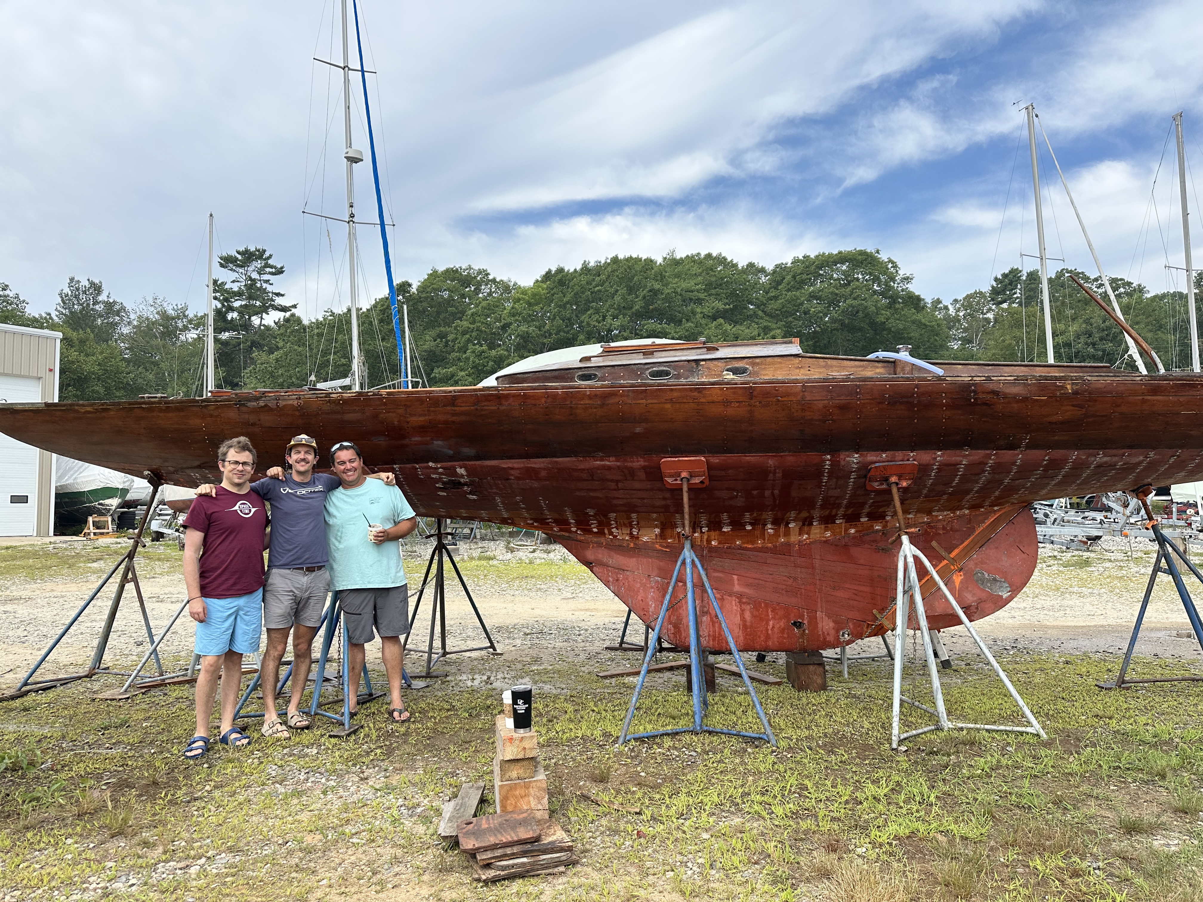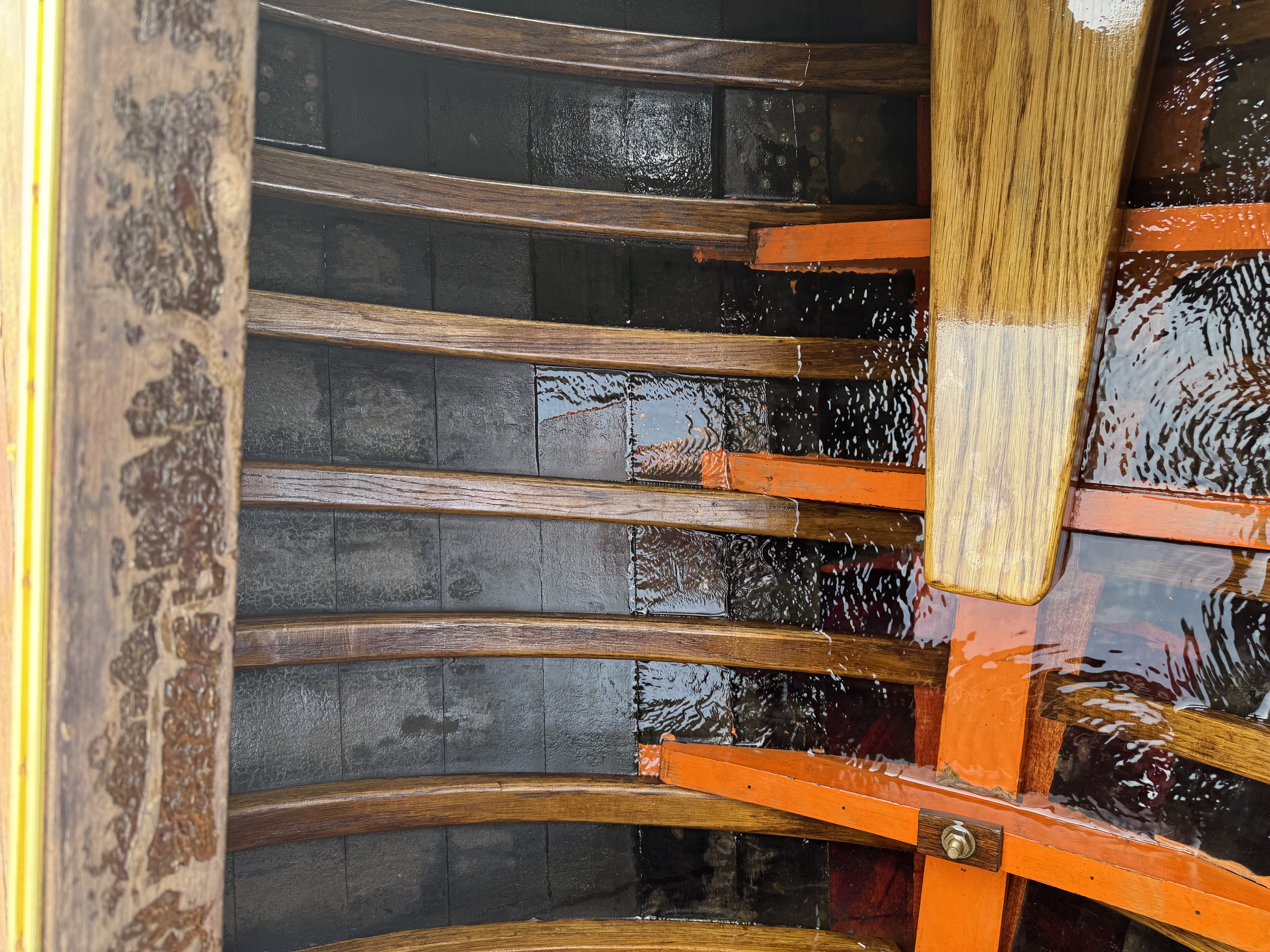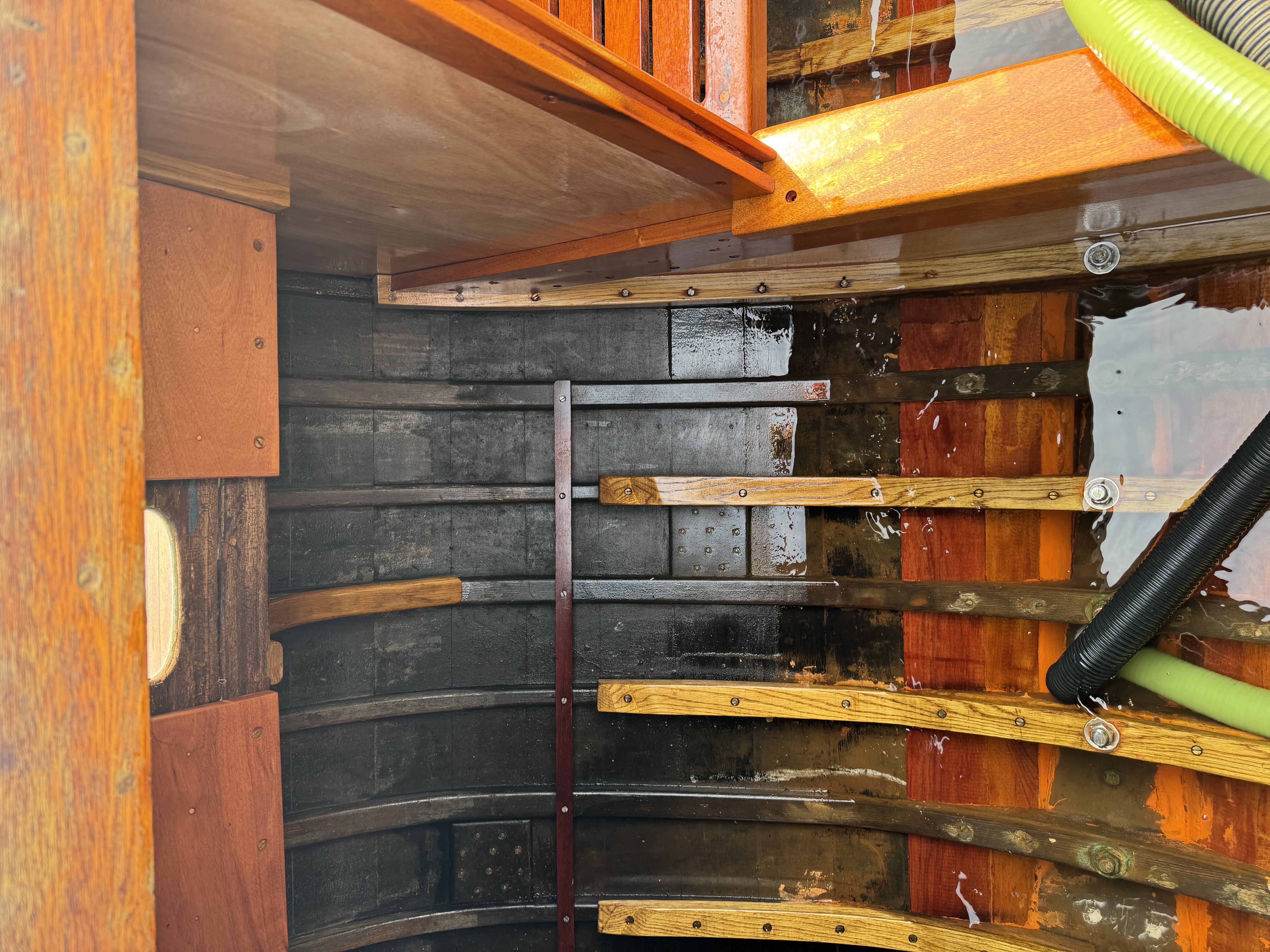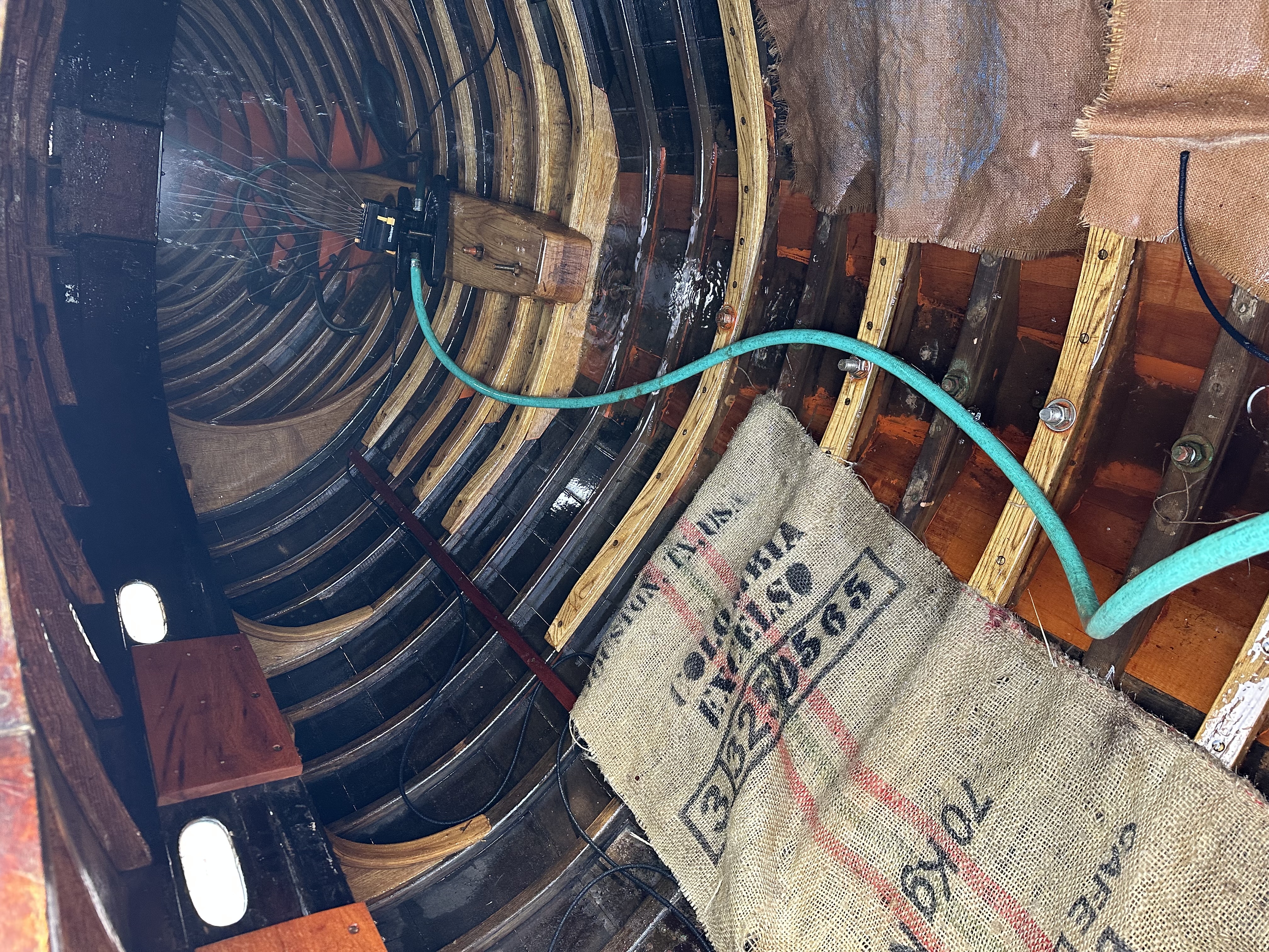 Ariadne is tight-seamed carvel. A carvel hull relies on the planks swelling with water to close up the seams, especially when there is no cotton caulking or seam compound to rely on. Especially when the boat has been out of the water for years and is totally dried out, before launch, you need to soak the hull for days. Running hoses over the topsides and sprinkers the interior to let the wood take up as much water as it can before launch. The alternative is launching dry and watching the ocean pour in. Turns out we did that anyway.