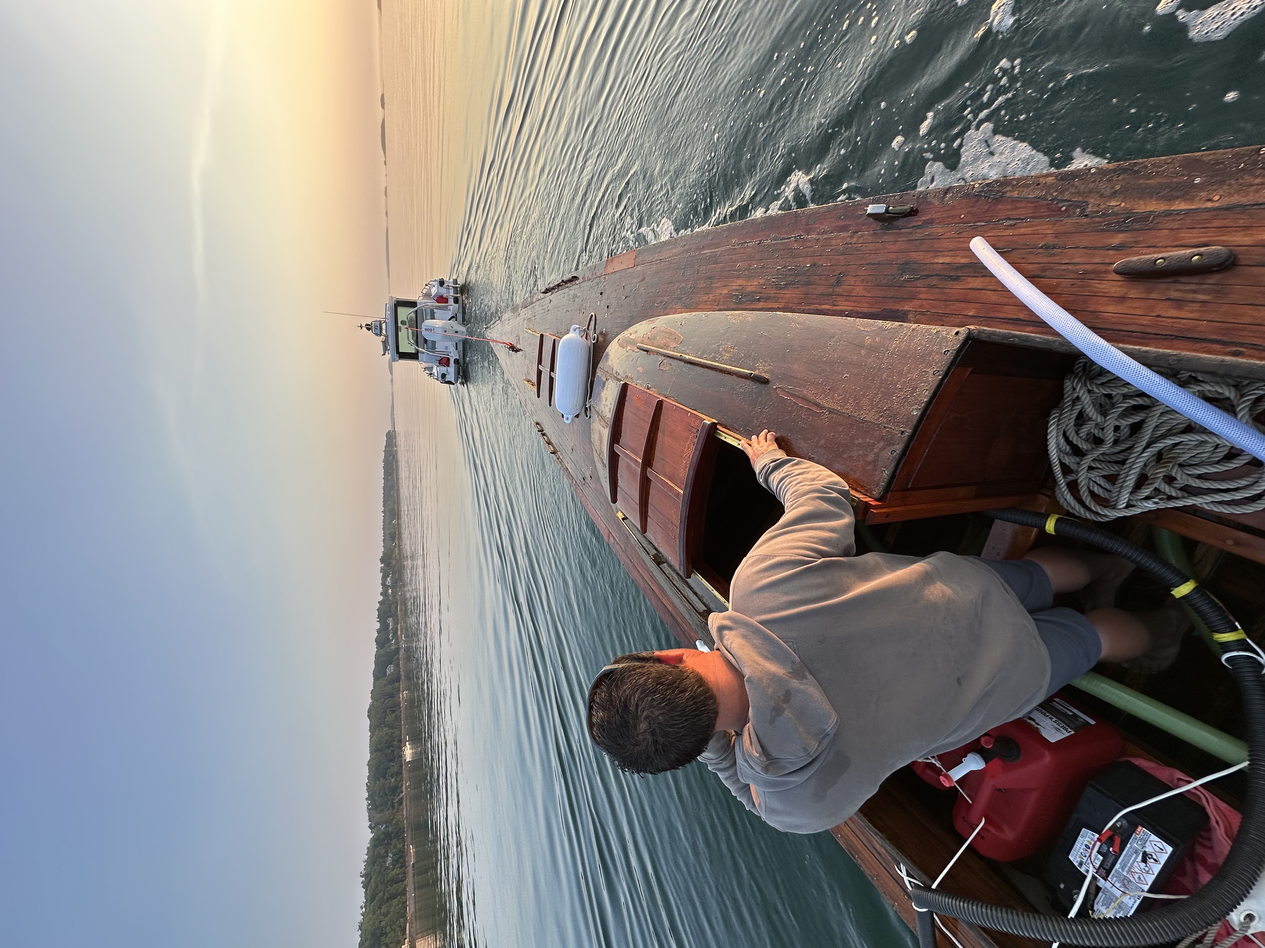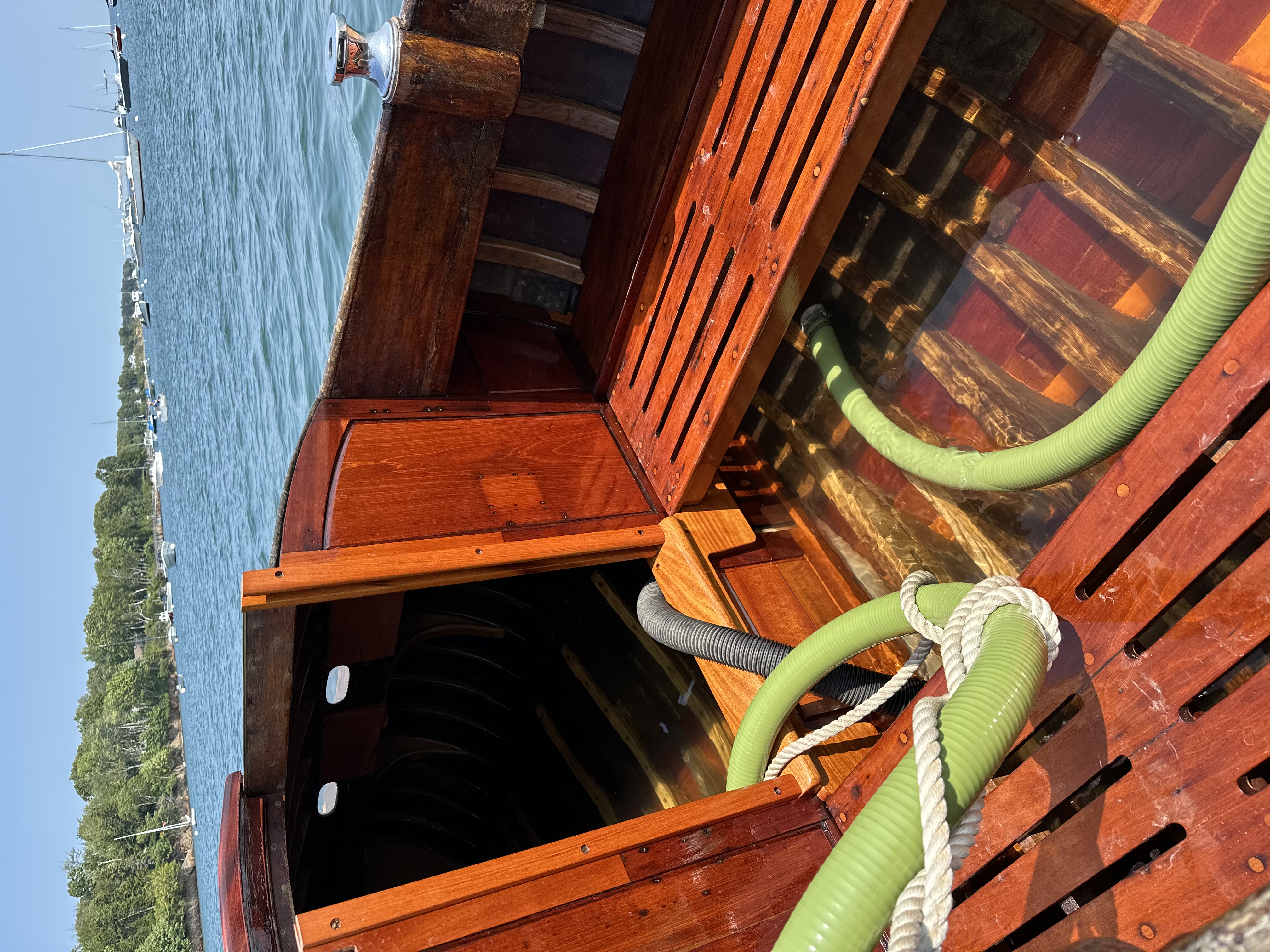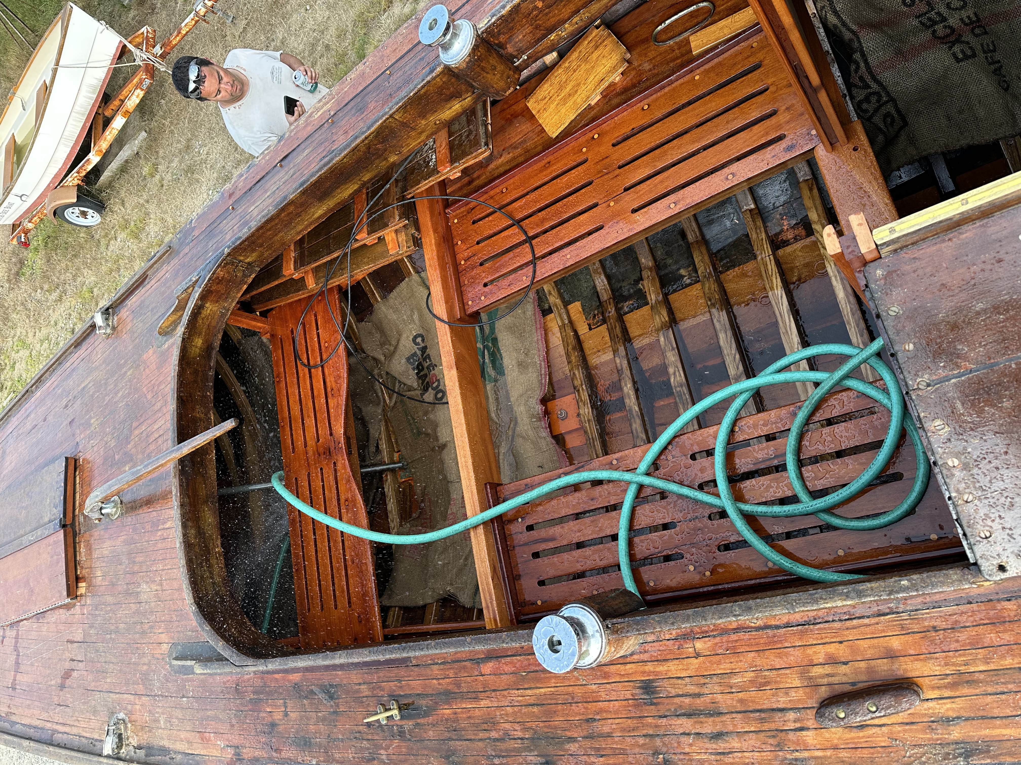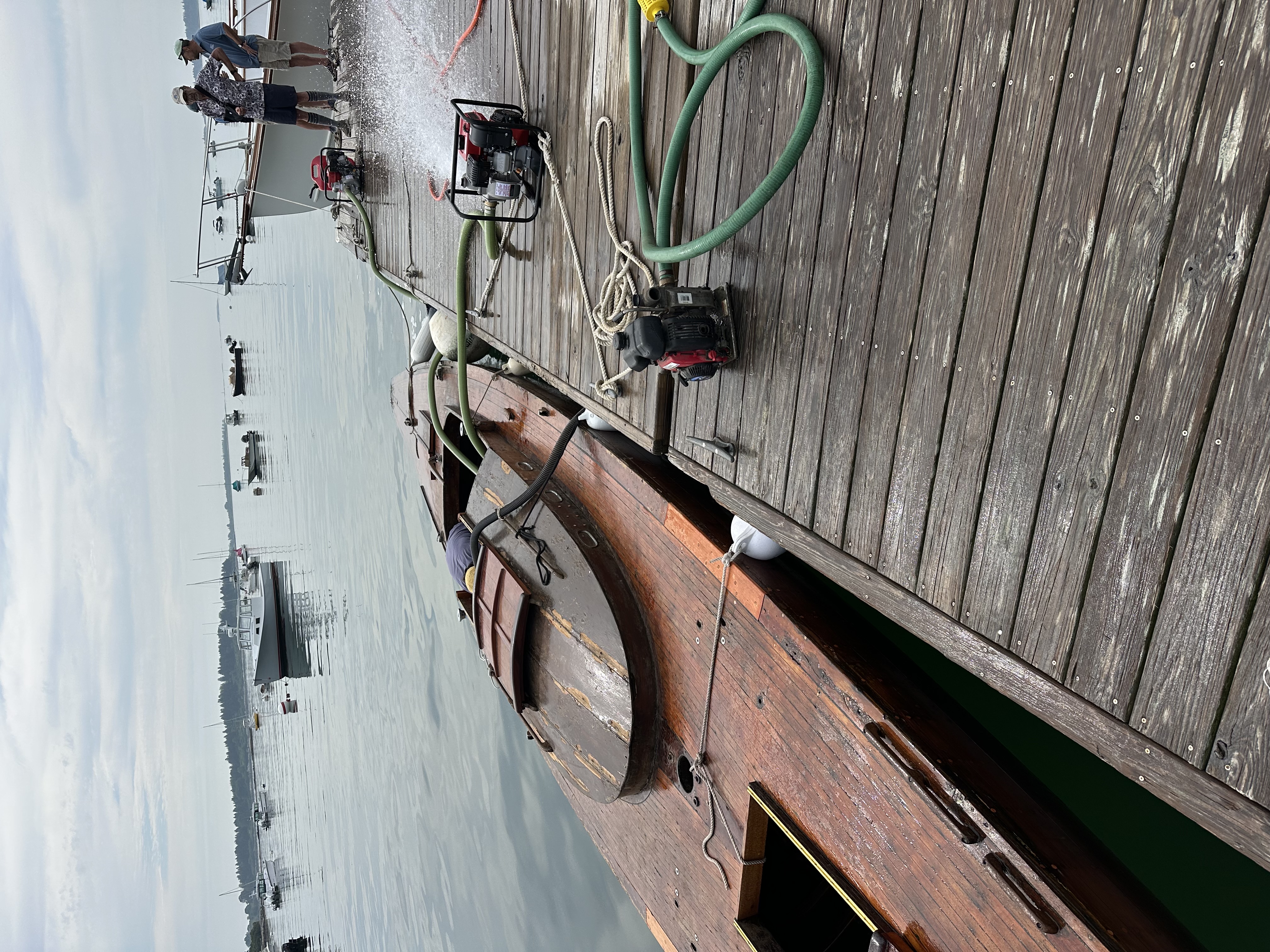 Every old wooden boat leaks at launch. You plan for it — bilge pumps at the ready, a watch schedule to have someone watching around the clock — but it’s still unnerving to see water pouring in from the outside! We also had absolutely no prior experience with this, so had no idea what to expect. I won’t lie. I thought it was about a coin flip as to whether we’d make it from the launch ramp to the float where we had two gas-powered trash pumps ready and waiting. The boatyard crew thought that we might be better served going back on the trailer. But we went for it, and it all worked out.