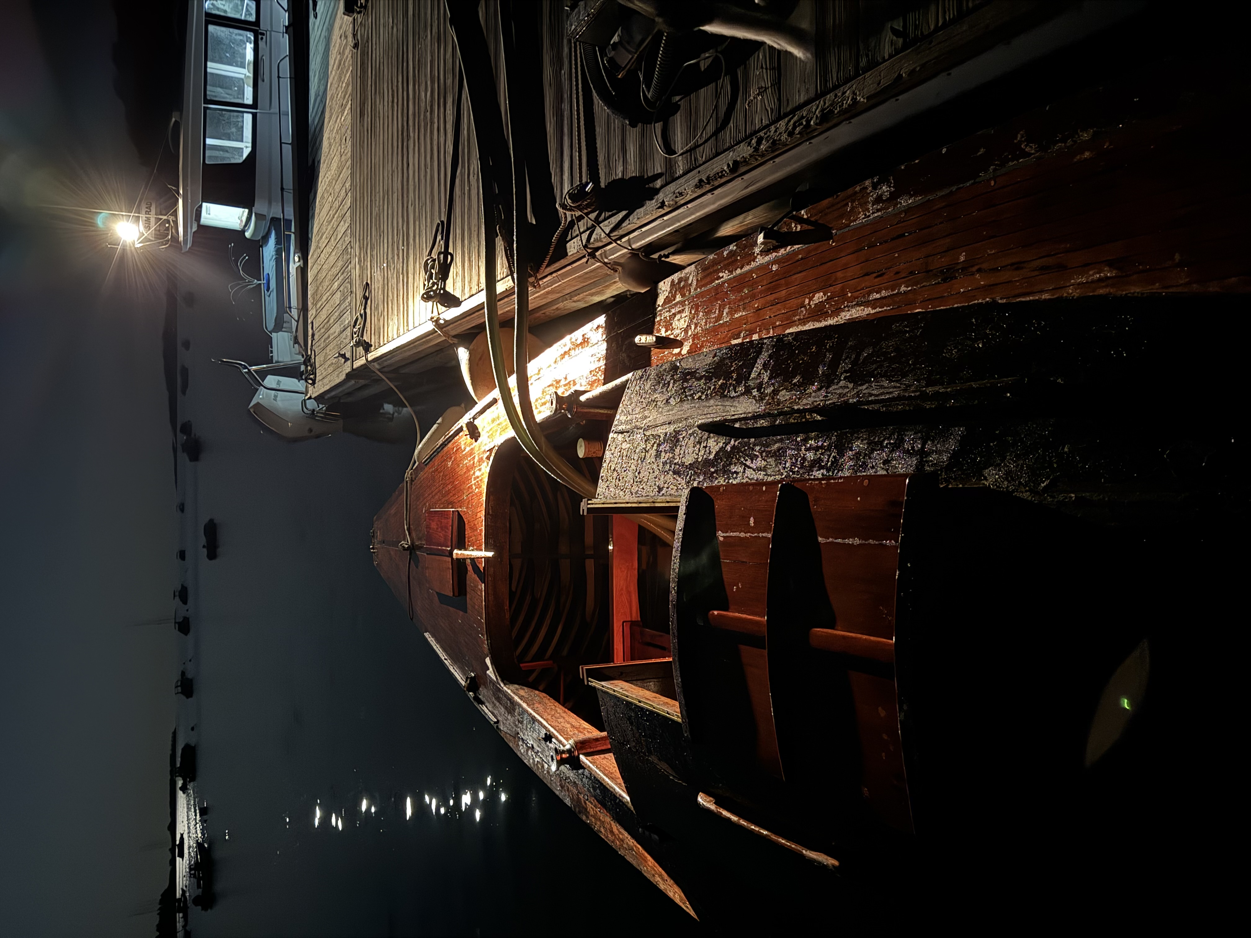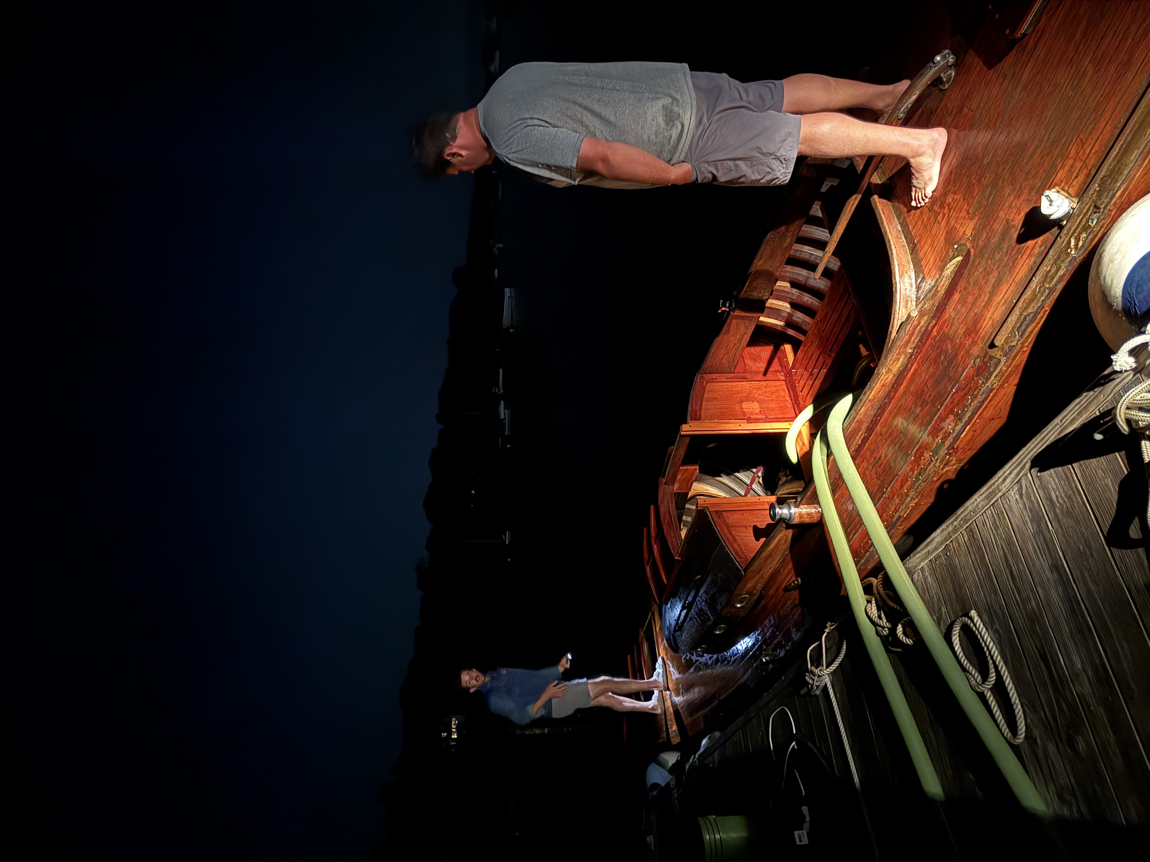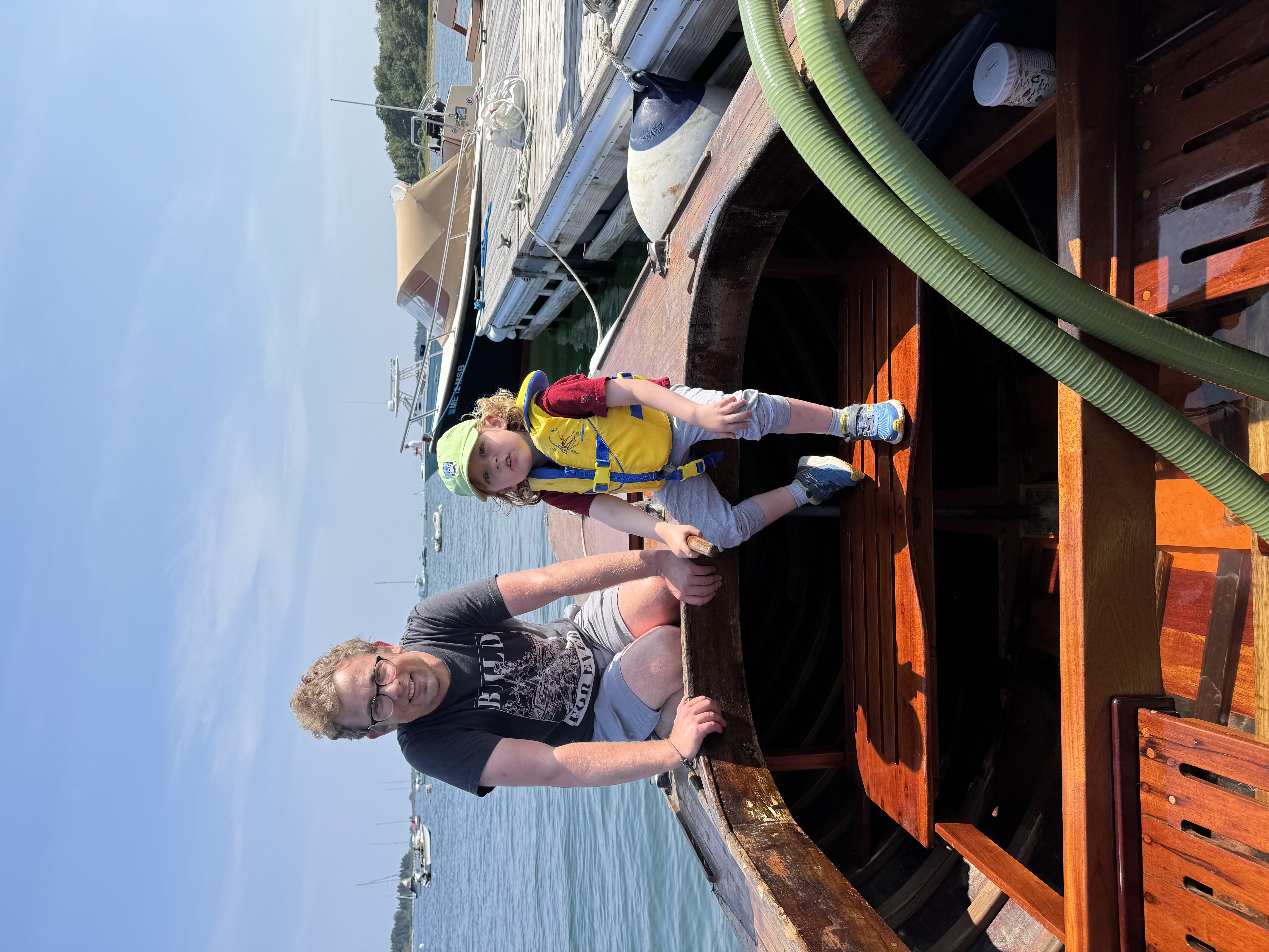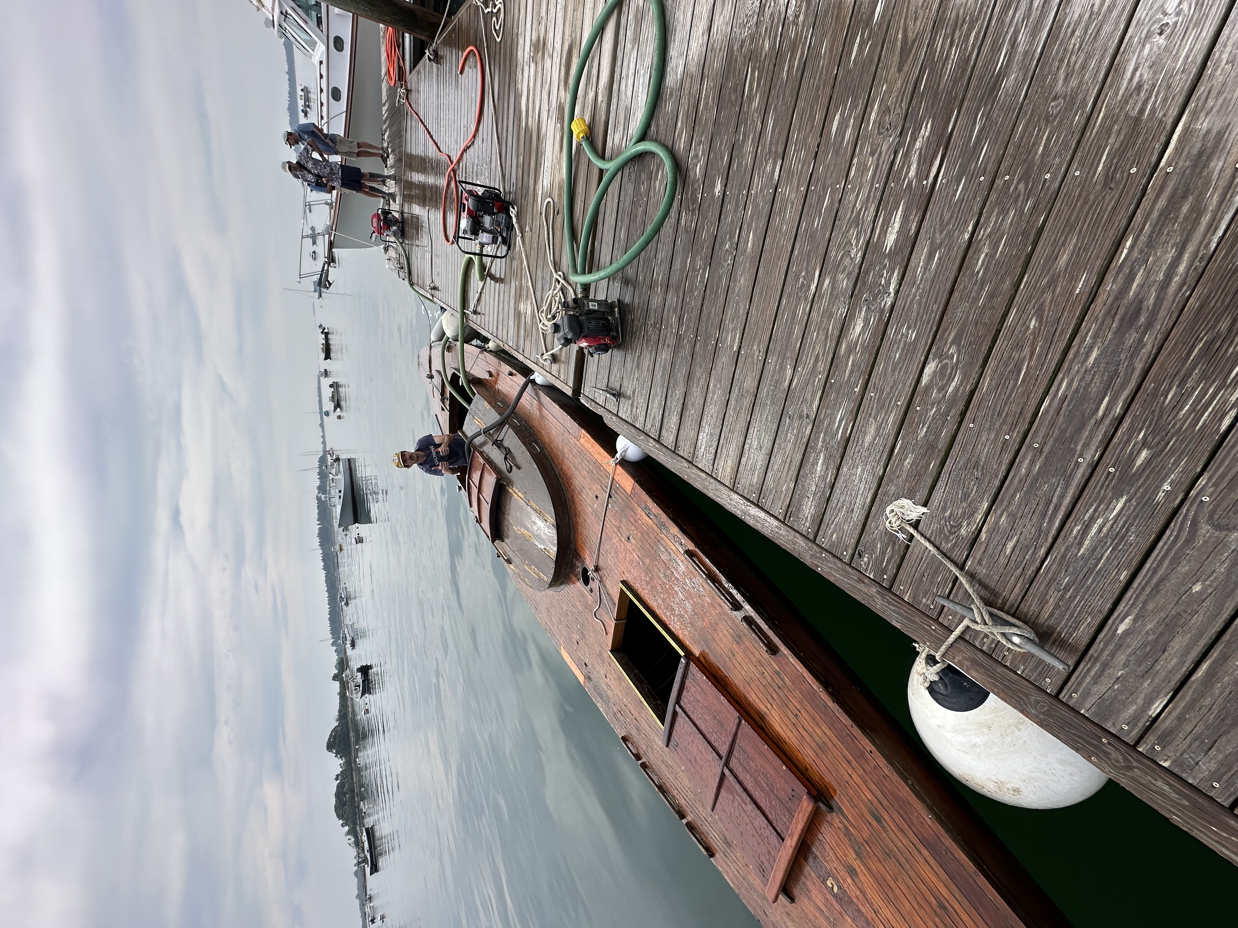Every old wooden boat leaks at launch. You plan for it — bilge pumps at the ready, a watch schedule to have someone watching around the clock — but it’s still unnerving to see water pouring in from the outside! We also had absolutely no prior experience with this, so had no idea what to expect. I won’t lie. I thought it was about a coin flip as to whether we’d make it from the launch ramp to the float where we had two gas-powered trash pumps ready and waiting. The boatyard crew thought that we might be better served going back on the trailer. But we went for it, and it all worked out.