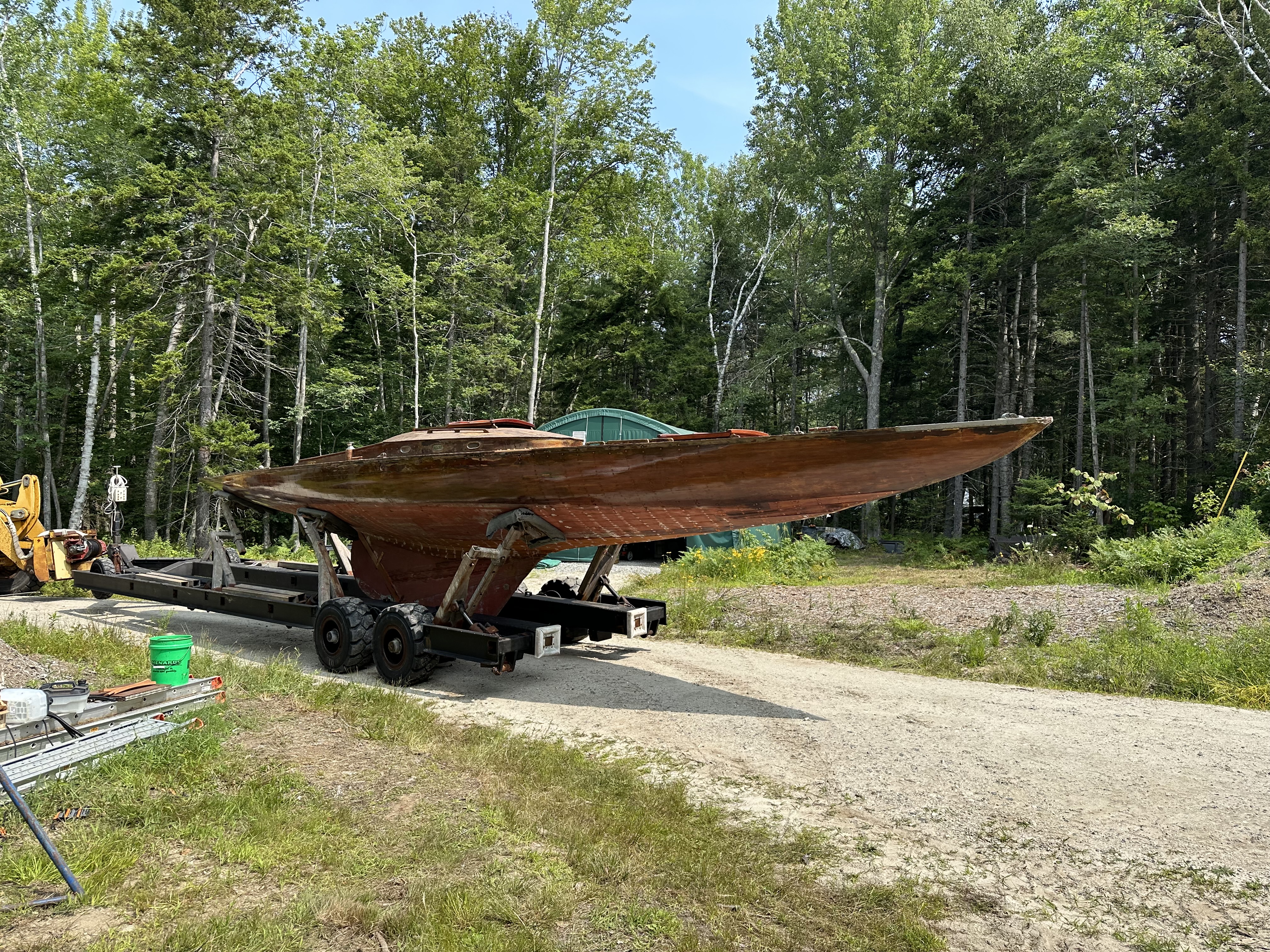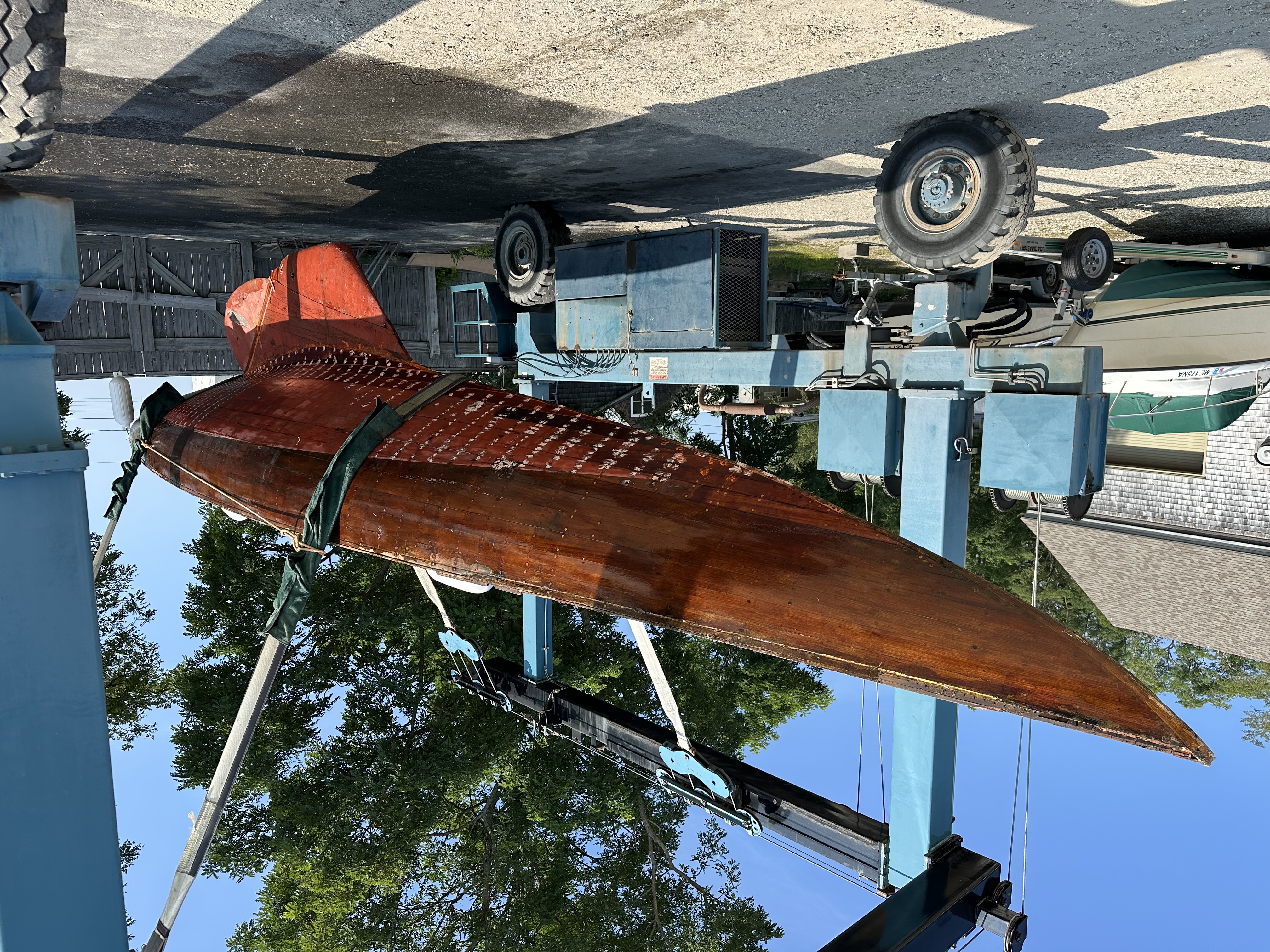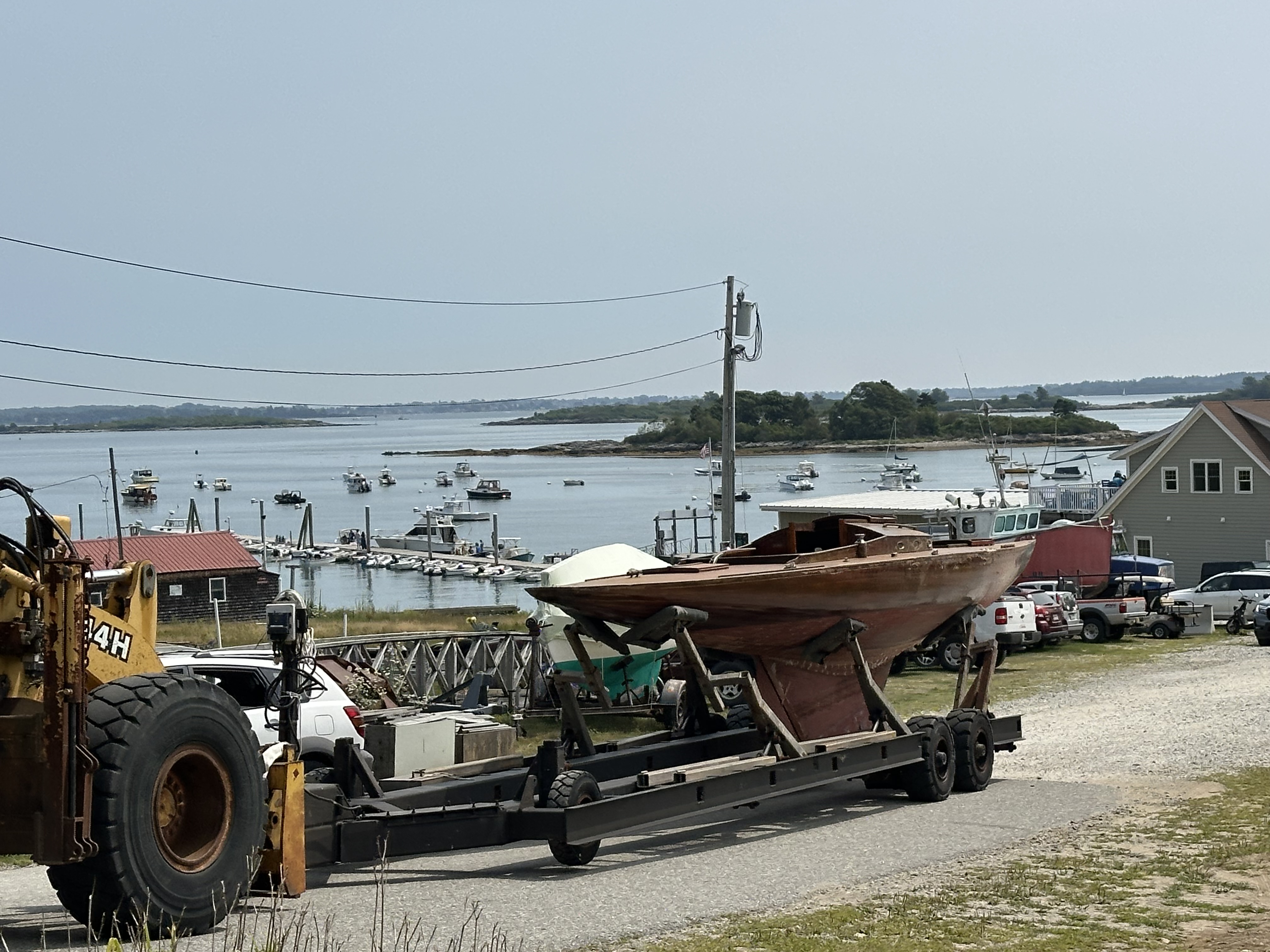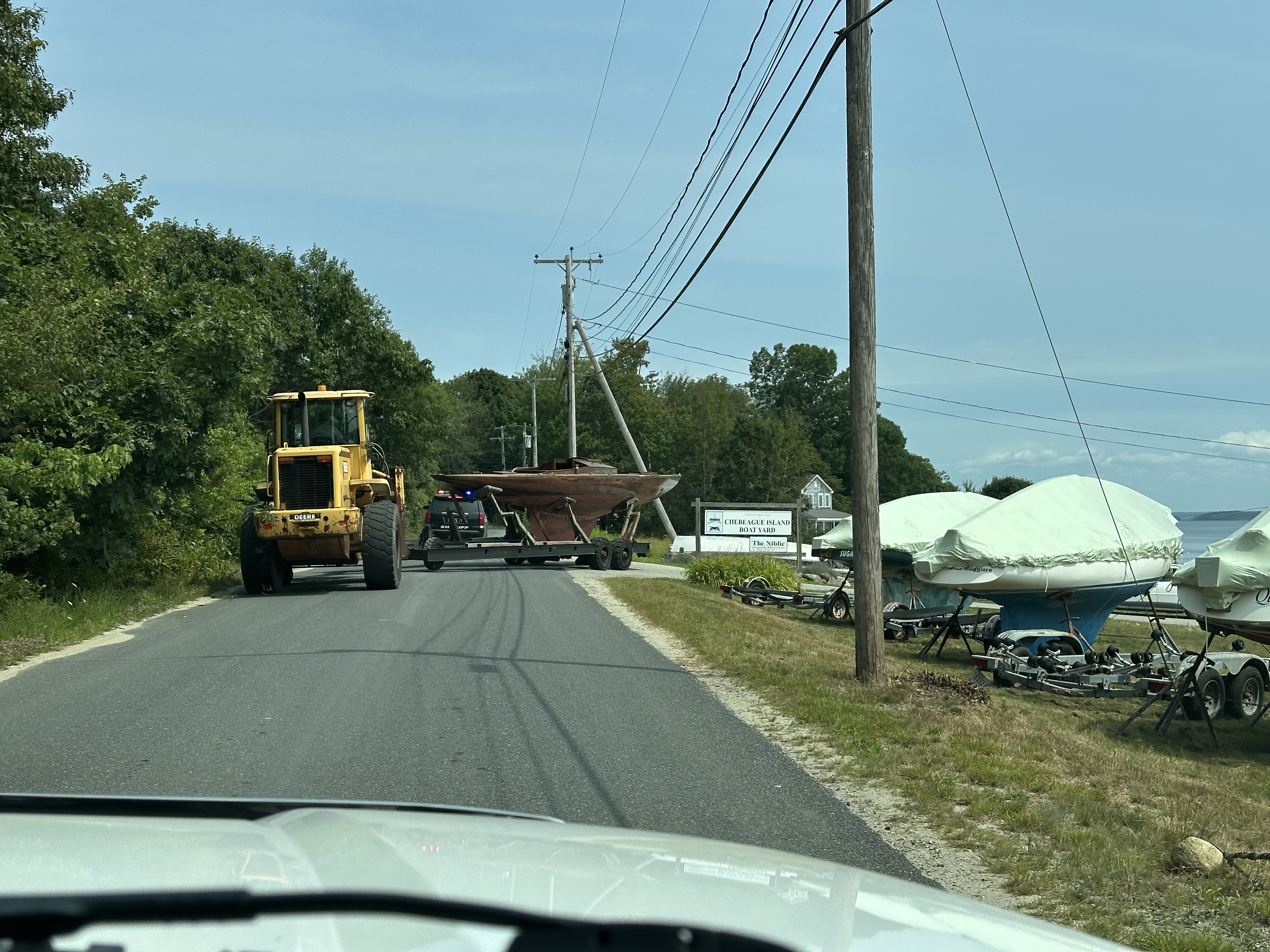 After three days, the leaking slowed to something manageable (pumps off for an hour at a time!) and it was time to get her off the island. She was towed across to the mainland and hauled out on the Travelift at Strouts Point for her transit to the midwest for further work.