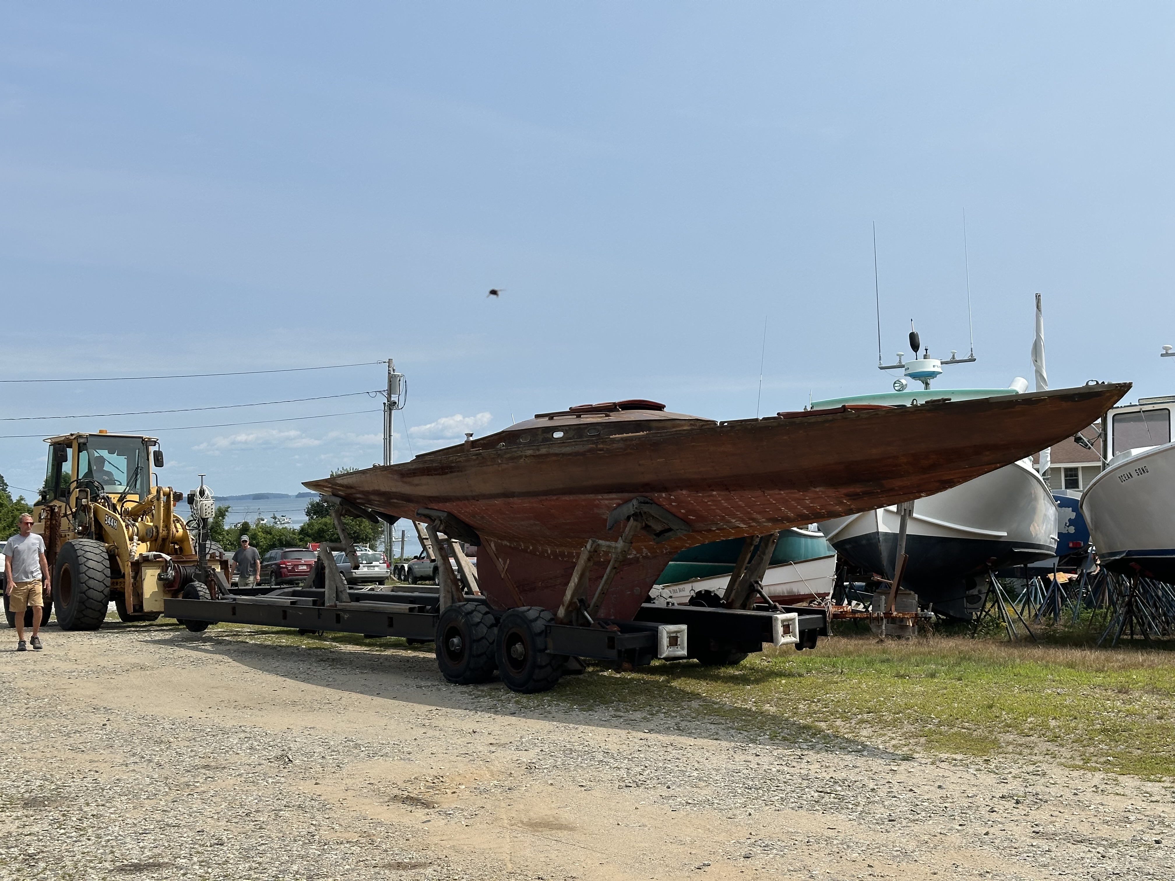 Getting Ariadne out of her tent involved the boatyard’s front-end loader, a pneumatic trailer, and some careful maneuvering.